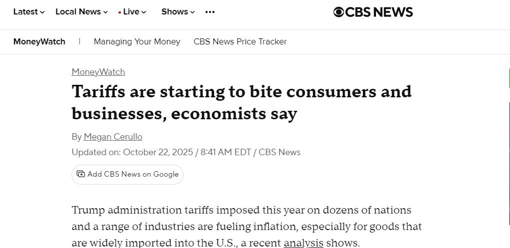 哥伦比亚广播公司(CBS)新闻网今年 10 月的报道也指出,美国政府实施的关税开始 " 咬噬 " 消费者和企业。经济学家指出,关税正在推高通胀,尤其是对大量进口的商品而言。进口商通常会将部分关税成本转嫁给消费者。今年关税预计将给美国企业额外增加 1.2 万亿美元成本,其中大部分由消费者承担。