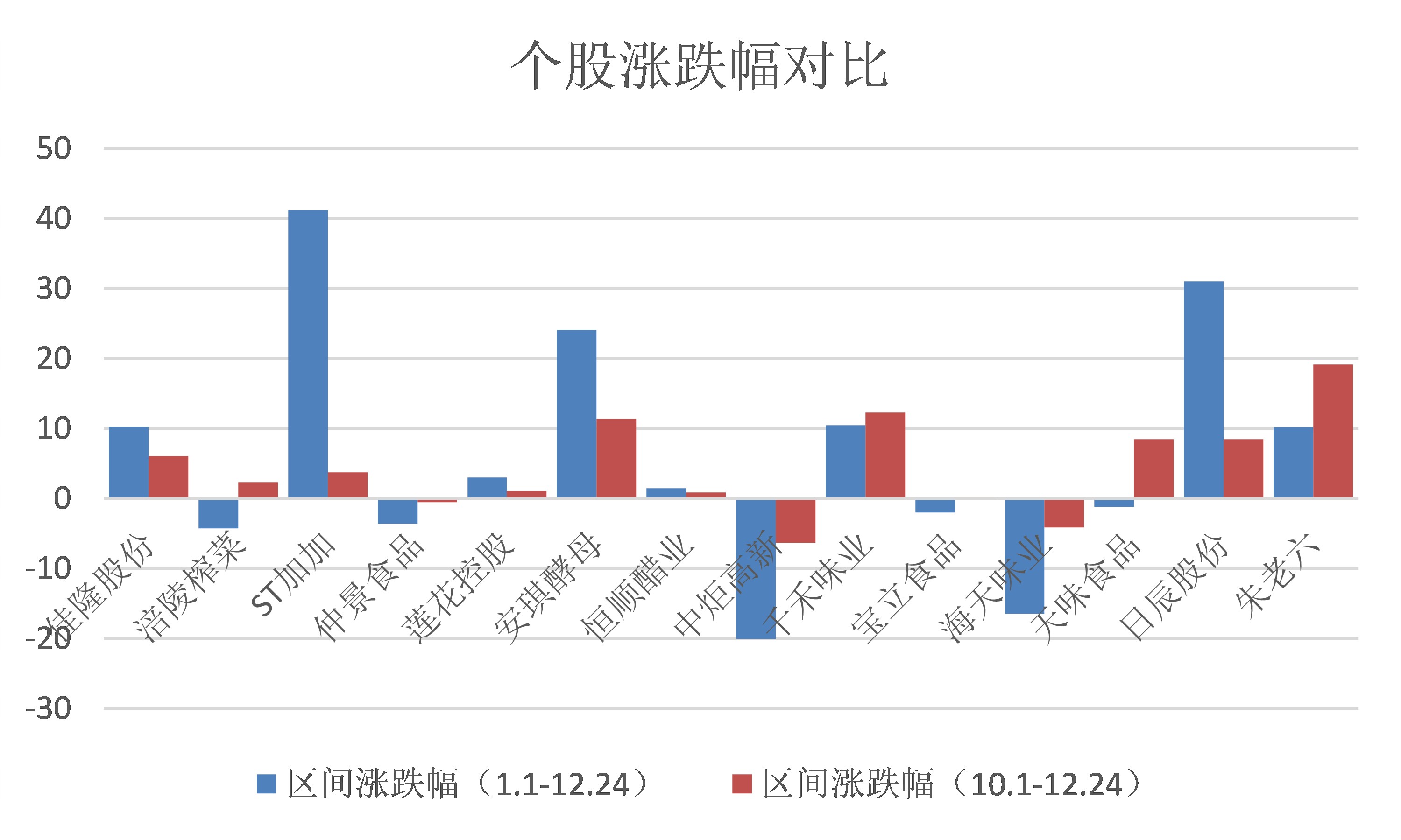 界面新闻记者进一步拆解反弹结构可见,当前股价上涨与基本面改善的节奏并不匹配。从个股表现看,2025年全年(截至12月24日)涨跌幅位居板块首位的安记食品涨幅达230%,仅四季度单季(截至12月24日)涨幅就达132%;此外,安琪酵母、千禾味业、日辰股份和朱老六在四季度涨幅居前,均实现10%以上的涨幅。与之形成反差的是,酱油板块市值体量更大的海天味业和中炬高新,为板块内仅有的两家四季度股价下跌的企业。