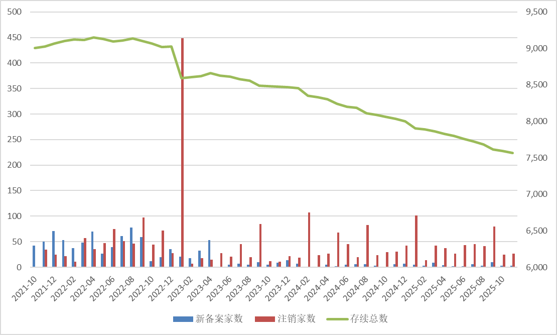 Wind数据显示,存续证券私募管理人总数曾在2023年1月一度单月骤降449家,并且自2023年5月以来截至2025年11月,已经连续31个月持续减少。