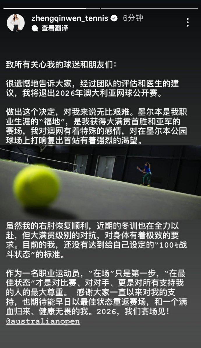 如今郑钦文通过社媒发布退出 2026 年澳网的个人声明如下: