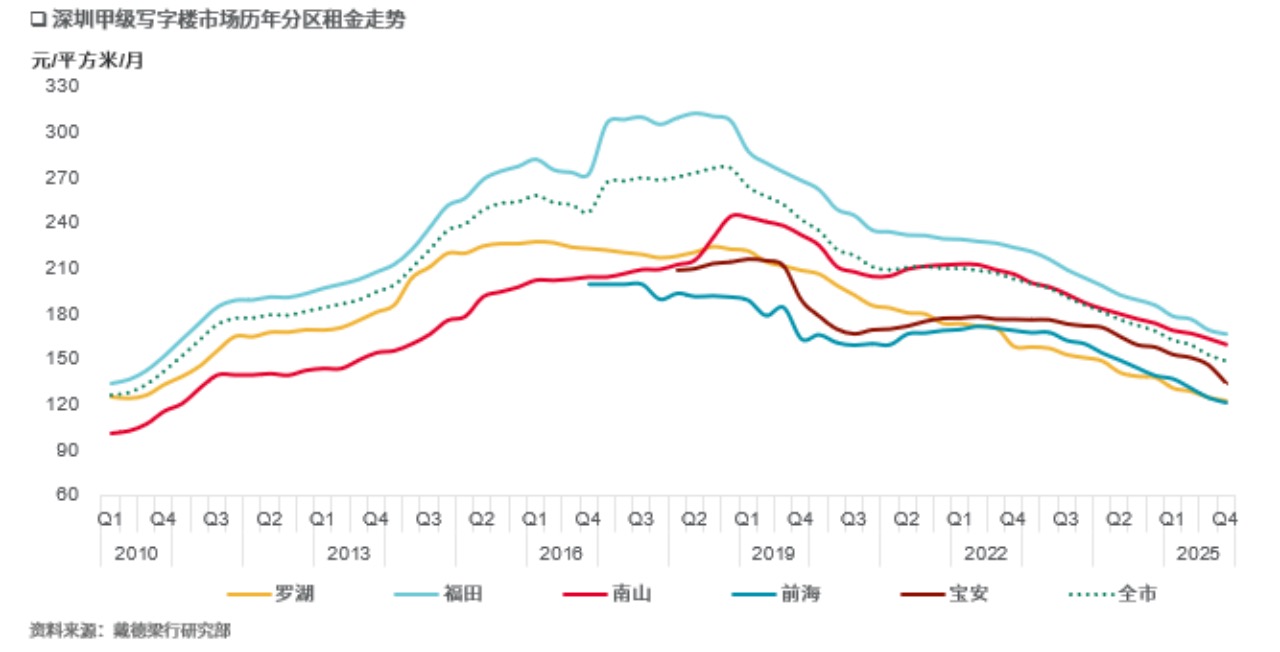截至2025年四季度末,深圳甲级写字楼平均租金跌至每月每平方米149.4元,较上年末下滑11.7%。不过不同片区的表现分化明显:核心区优质项目凭借完善的配套与优越的区位,租金降幅相对可控;而新兴片区的部分项目,为了争夺客户不得不放下身段,通过大幅降价、延长免租期等方式让利,区域租金差距进一步拉大。