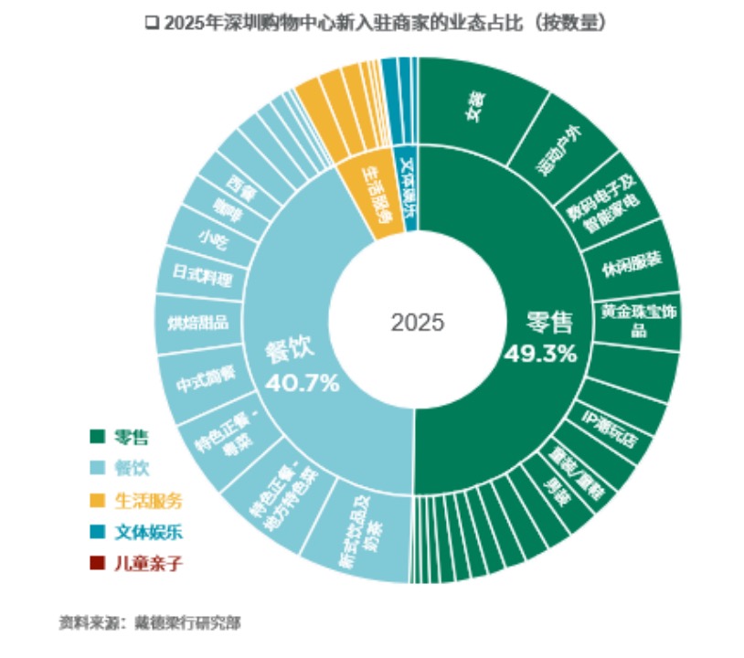 从2025年深圳购物中心新入驻商家的占比来看,零售业态仍牢牢占据主导地位,占比达49.3%;餐饮业态占比升至40.7%,成为拉动客流的重要引擎;生活服务类业态占比也微增至5.4%。