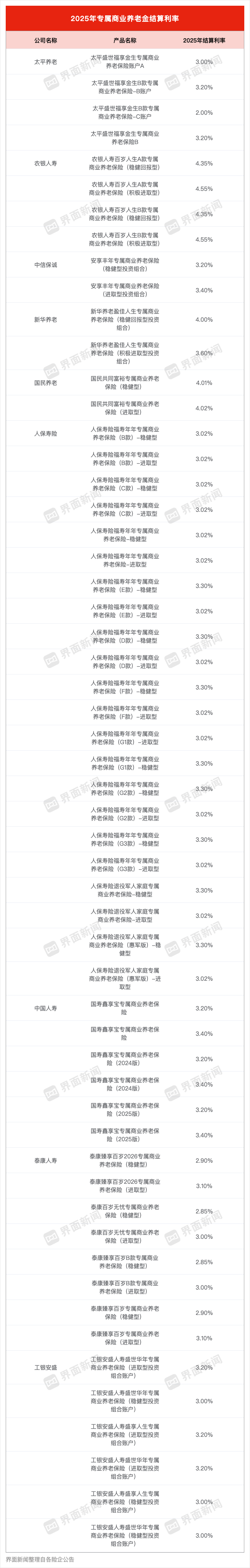 界面新闻注意到,目前在售的个人养老金保险产品在专属商业养老保险之外,年金险、两全险、万能险也不断被补充进名单。