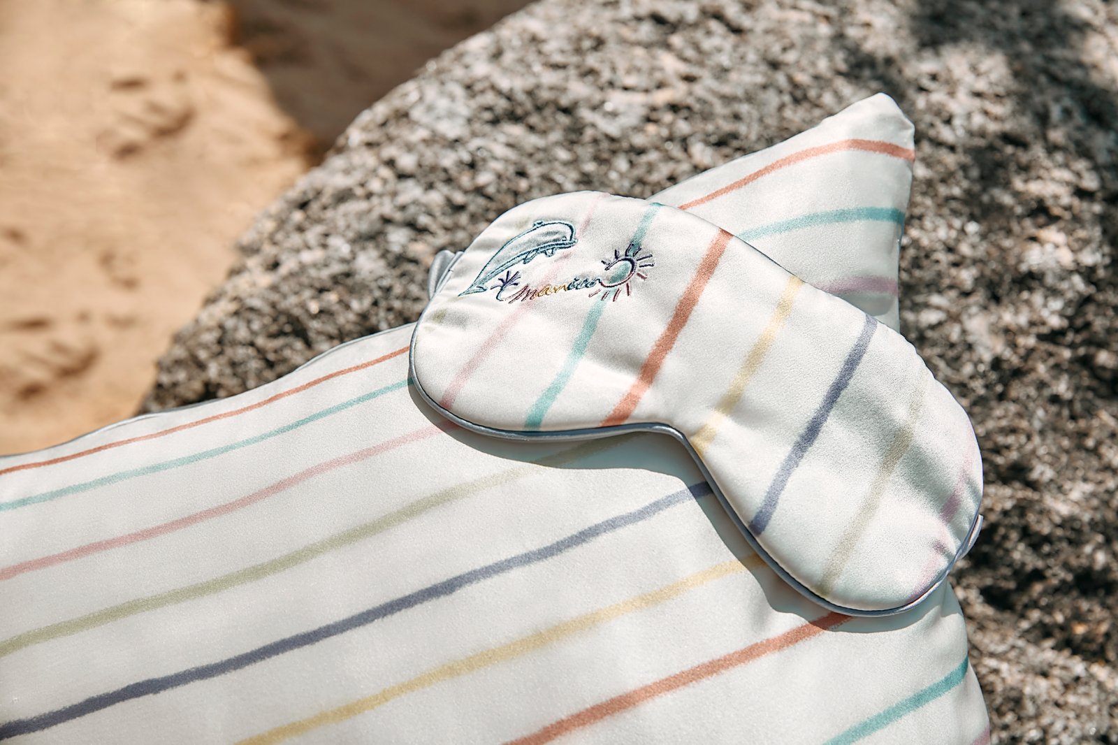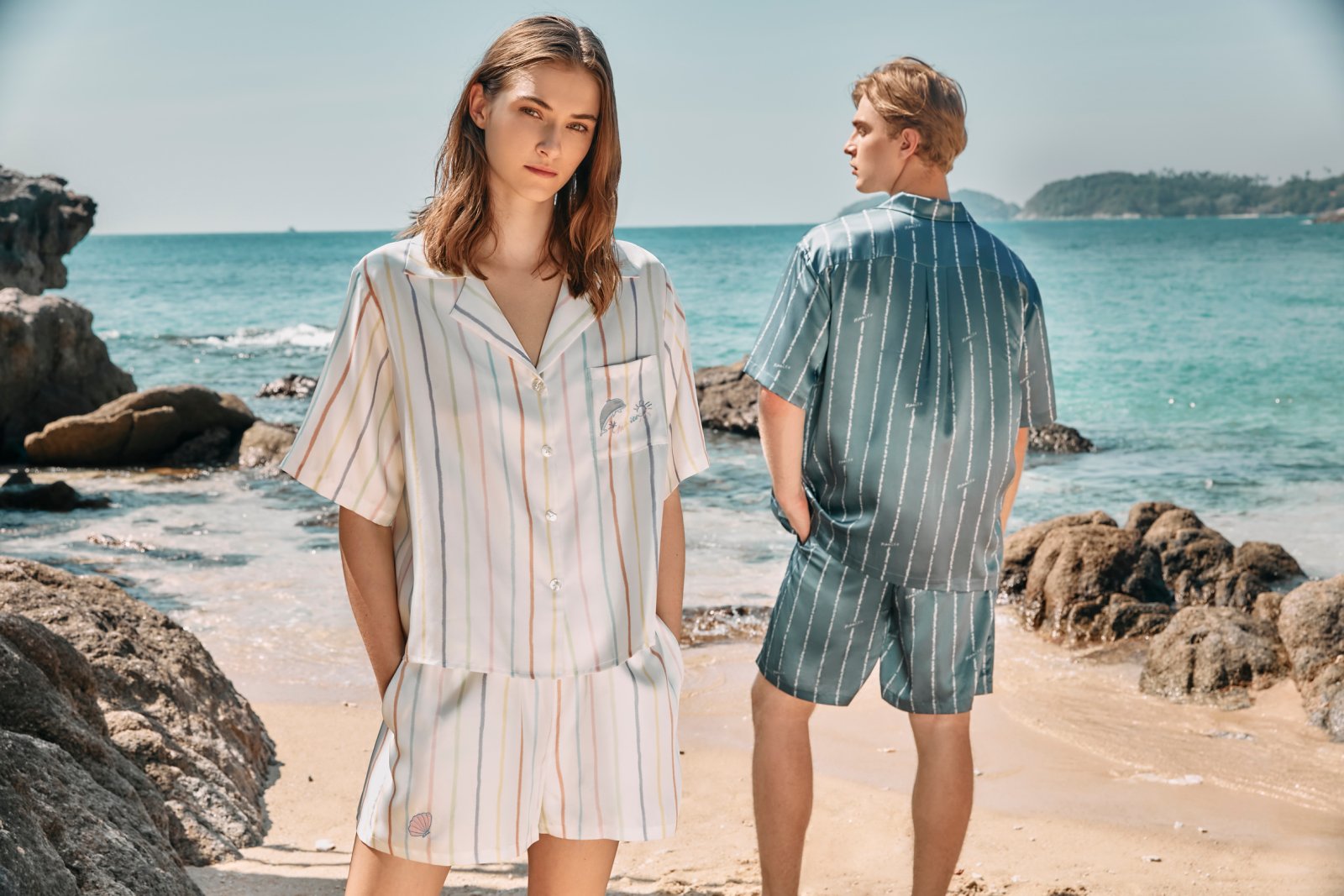 除了蓝色之外,Manito还把来自珍珠的银白色作为该系列的另一种主调,这涵盖了家居服短套装和连衣裙等单品。为了避免大面积纯色系可能带来的单调感,Manito特地为这一系列银白色服饰添上了彩虹条纹印花,海豚和贝壳图案则采用了贴布绣工艺制成。