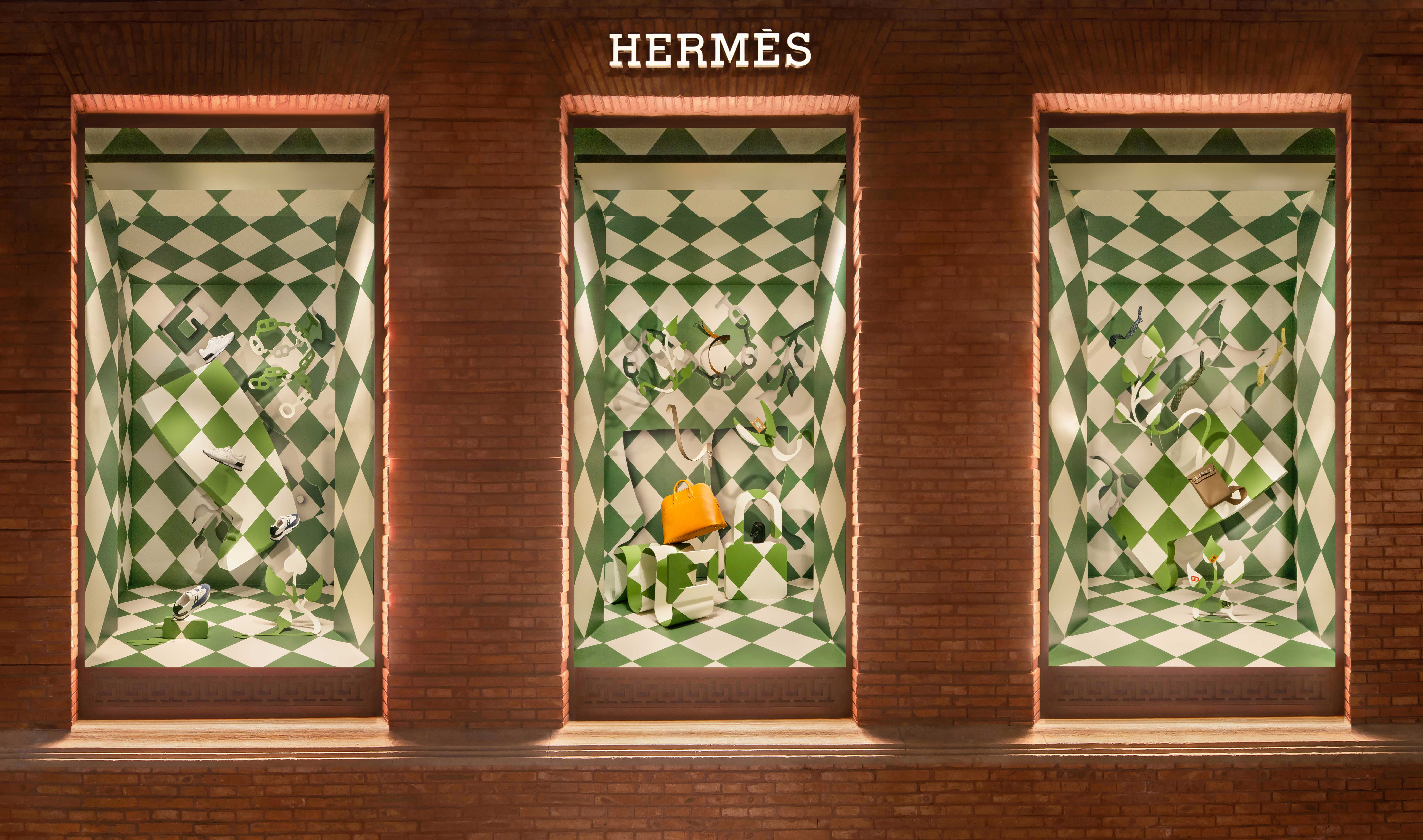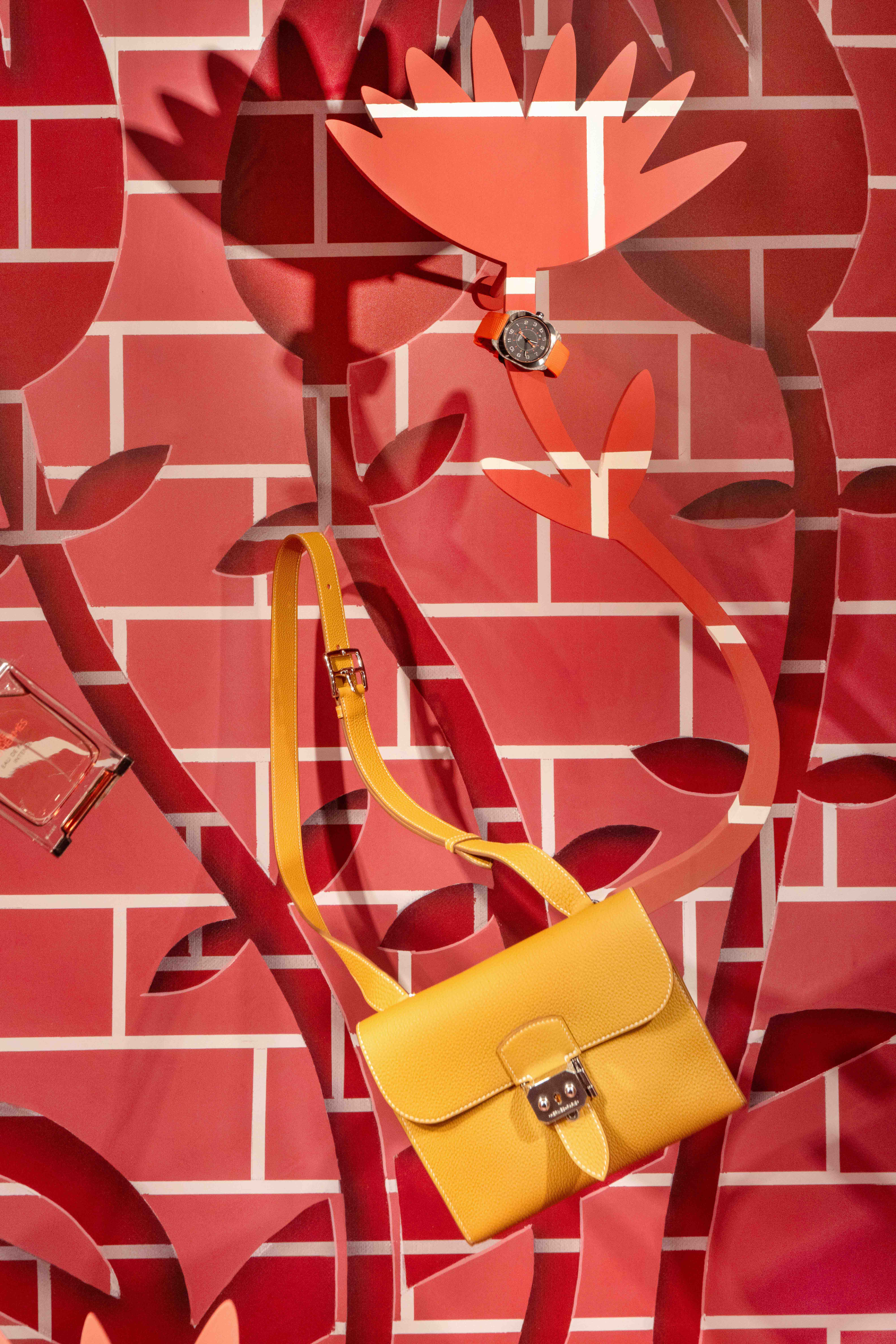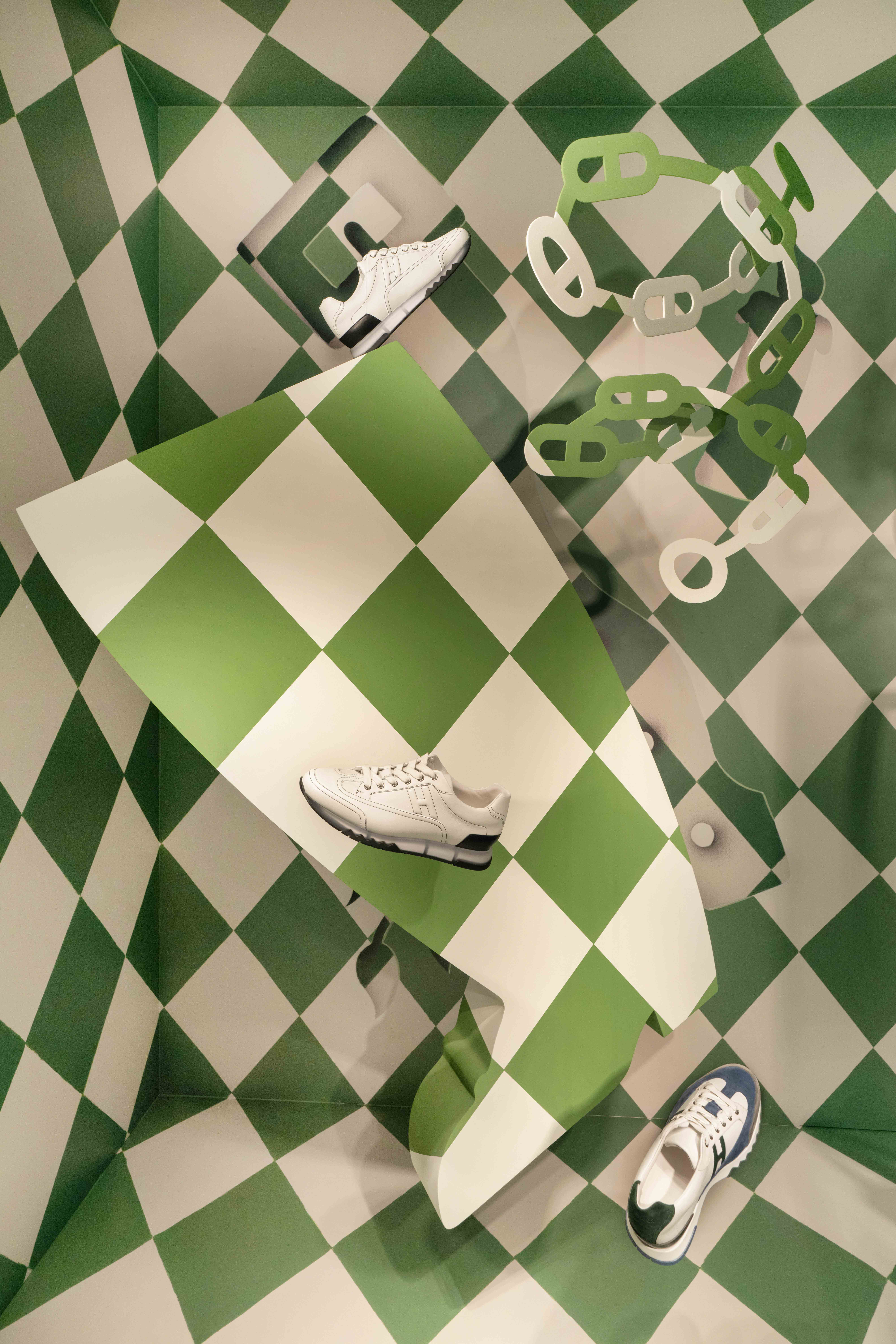 反映到此次的橱窗设计中,Charline Tyberghein巧妙地运用线条、方格和砖墙纹路来营造错视背景,鞋履、手袋和花卉的剪影交错其中,潜藏的春日趣味悄然涌现。与之进行搭配的是一系列爱马仕的经典产品,包括Trail运动鞋、Mini Medor手袋和Kelly Multipocket To Go手包,这些原本摆放于货架上的静物在此获得了生机。
