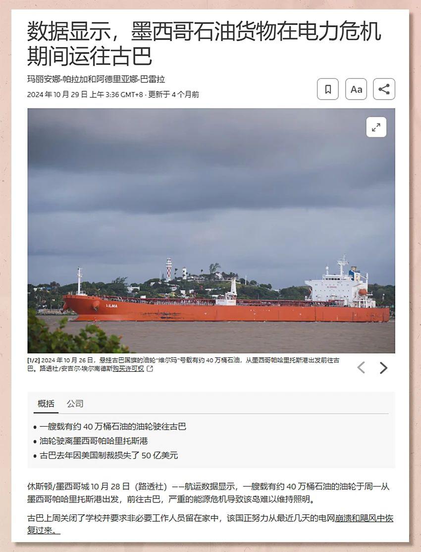 2024 年 4 月以来,墨西哥每天向古巴提供约 1 万 3 千桶轻质原油,超过俄罗斯成为古巴原油最大供应国。