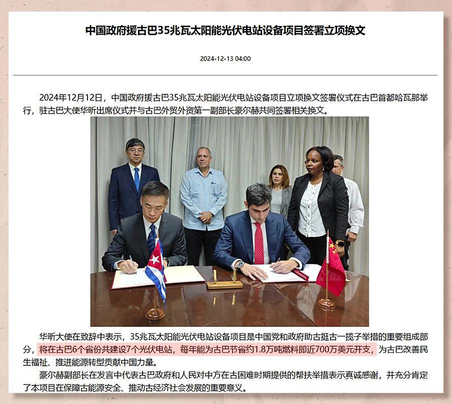 在中古 " 一带一路 " 合作框架内,能源合作也成为重要内容。2024 年 12 月 12 日,中国政府援古巴 35 兆瓦太阳能光伏电站设备项目立项换文签署。古巴未来面临的或将是国家现代化的综合诉求,而不仅是电力领域的发展。