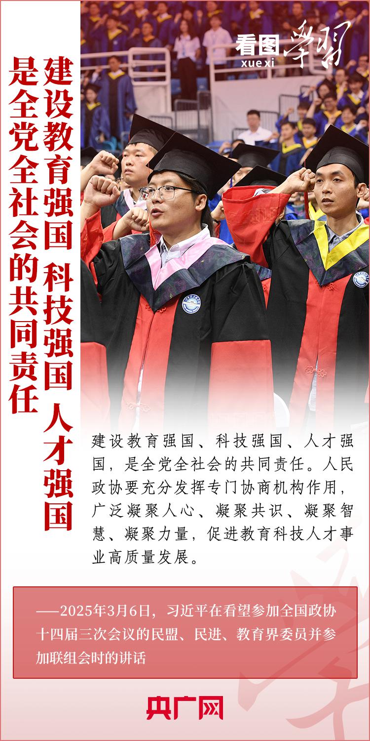 " 建设教育强国、科技强国、人才强国,是全党全社会的共同责任。"3 月 6 日,习近平总书记在看望参加全国政协十四届三次会议的民盟、民进、教育界委员并参加联组会时发表重要讲话。总书记就做好教育、科技、人才工作作出深刻阐释,强调必须深刻把握中国式现代化对教育、科技、人才的需求,强化教育对科技和人才的支撑作用,进一步形成人才辈出、人尽其才、才尽其用的生动局面。一起来学习!