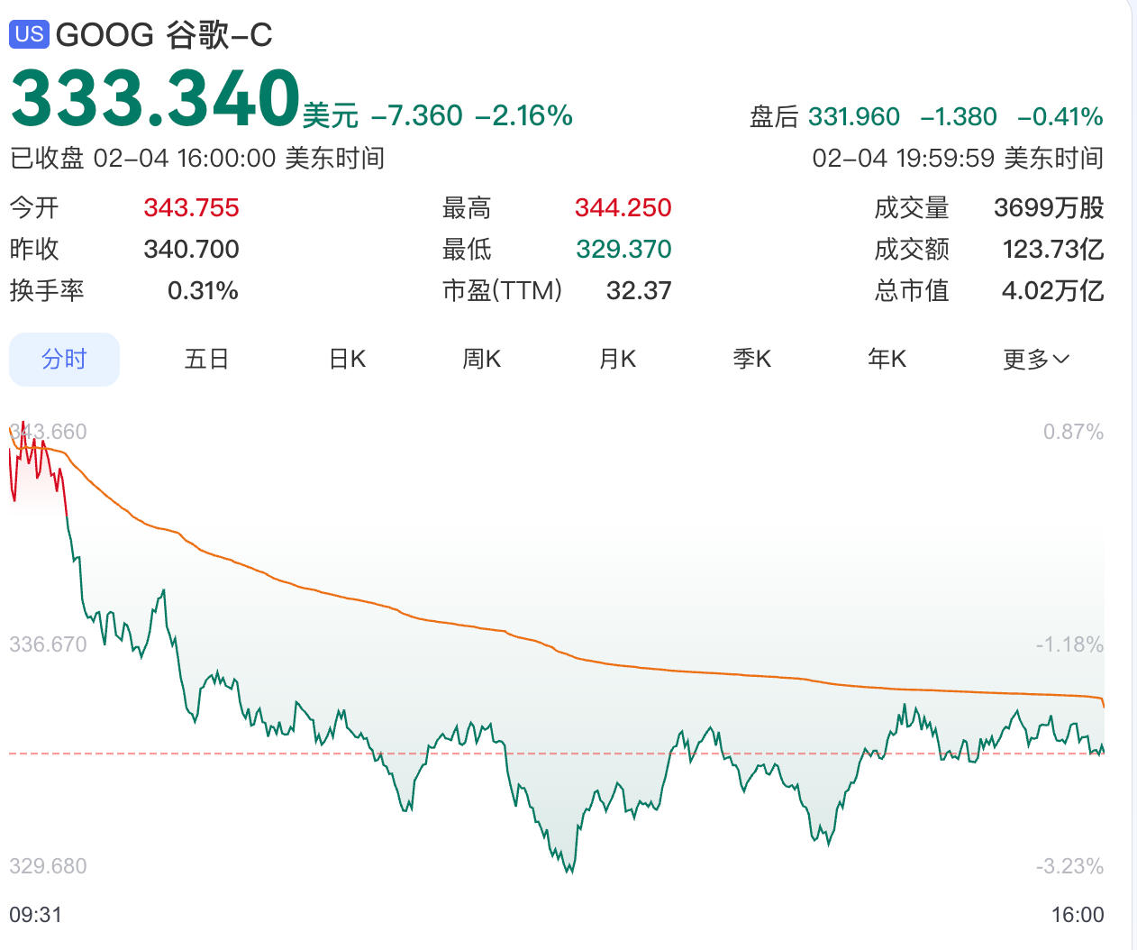 资本市场对谷歌巨额的资本支出计划也表现出了分歧;隔夜美股收盘,谷歌股价下跌1.96%收于每股333.04美元,总市值4.02万亿美元。财报发布后,谷歌股价盘后一度跌超7%,随后又反弹转涨,最终跌幅收窄至0.41%。