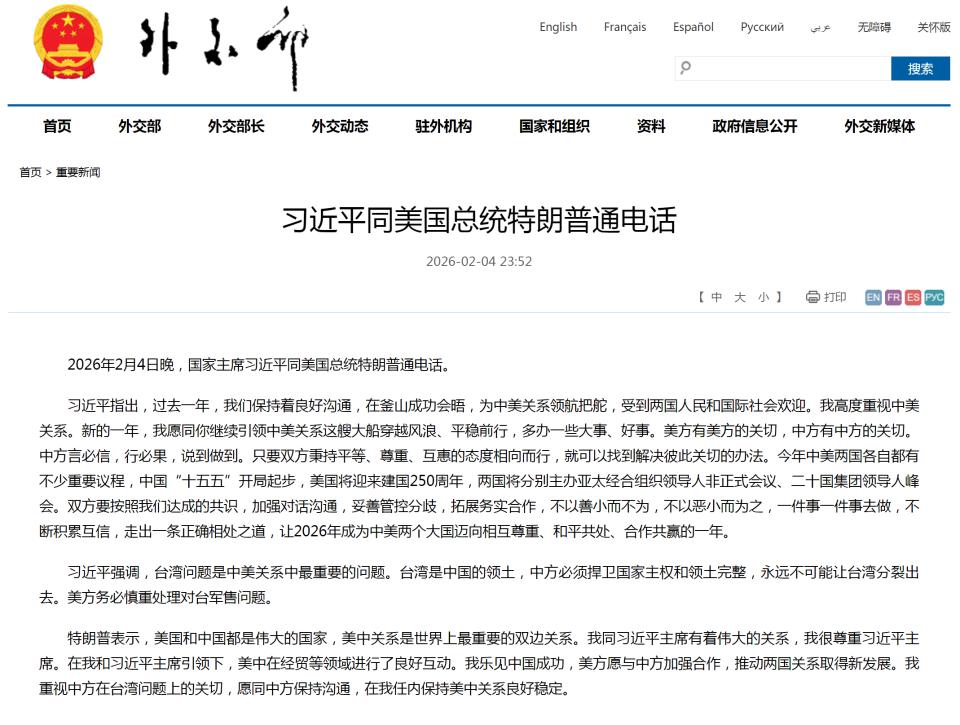 中国元首在通话中着力强调,高度重视中美关系,台湾问题作为中美关系中最重要的问题,自然是中方始终聚焦、关切的最大焦点。事实上,中国元首此前已在不同场合反复重申,台湾问题是中国核心利益中的核心,是中美关系政治基础中的基础,是中美关系第一条不可逾越的红线。在 2026 年的新年贺词中,中国元首也强调指出,两岸同胞血浓于水,祖国统一的历史大势不可阻挡!当时,敏锐的 " 今日俄罗斯 " 电视台报道新年贺词,就在标题中突出了这一主题信息。