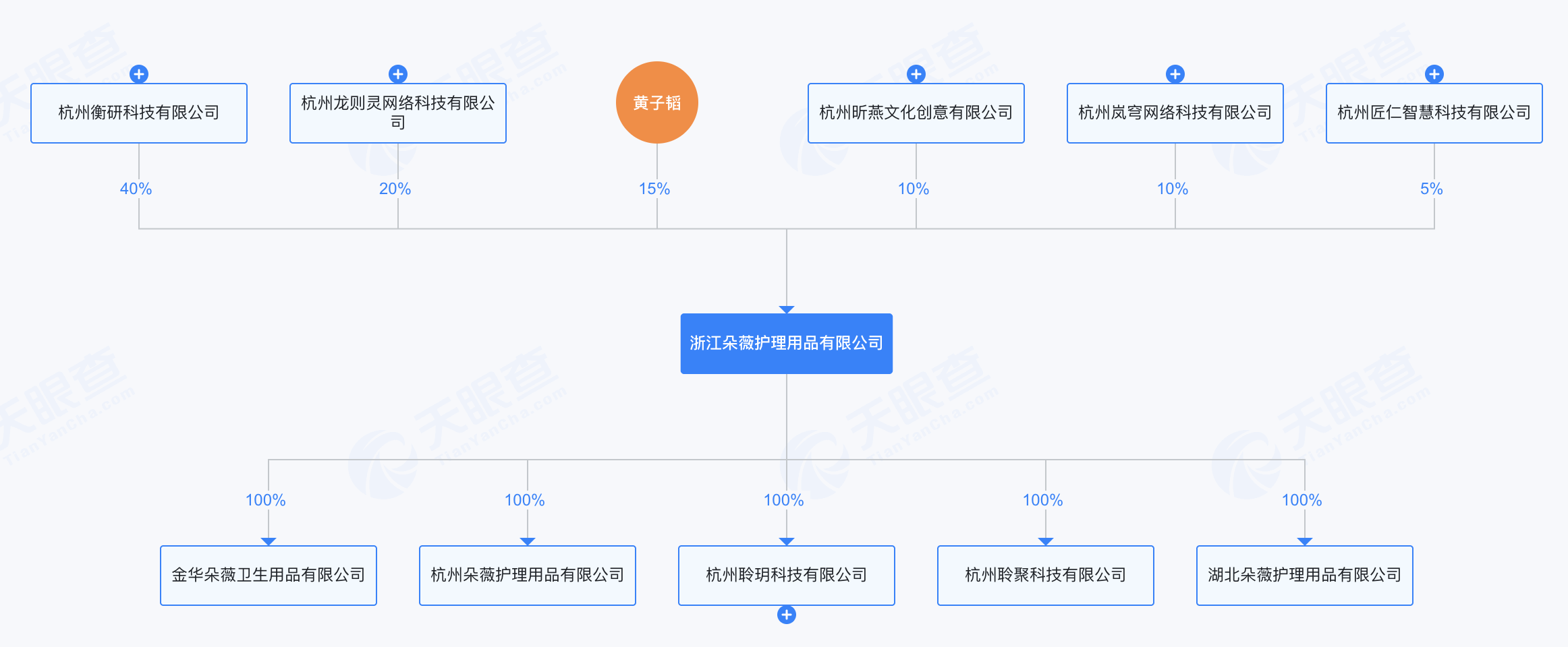 浙江朵薇护理是朵薇的核心生产工厂。该公司的股东信息显示,黄子韬直接持股15%,间接持股比例4.312%。其他两大股东分别是杭州衡研科技有限公司和杭州龙则灵网络科技有限公司,两家公司分别持股40%和20%。