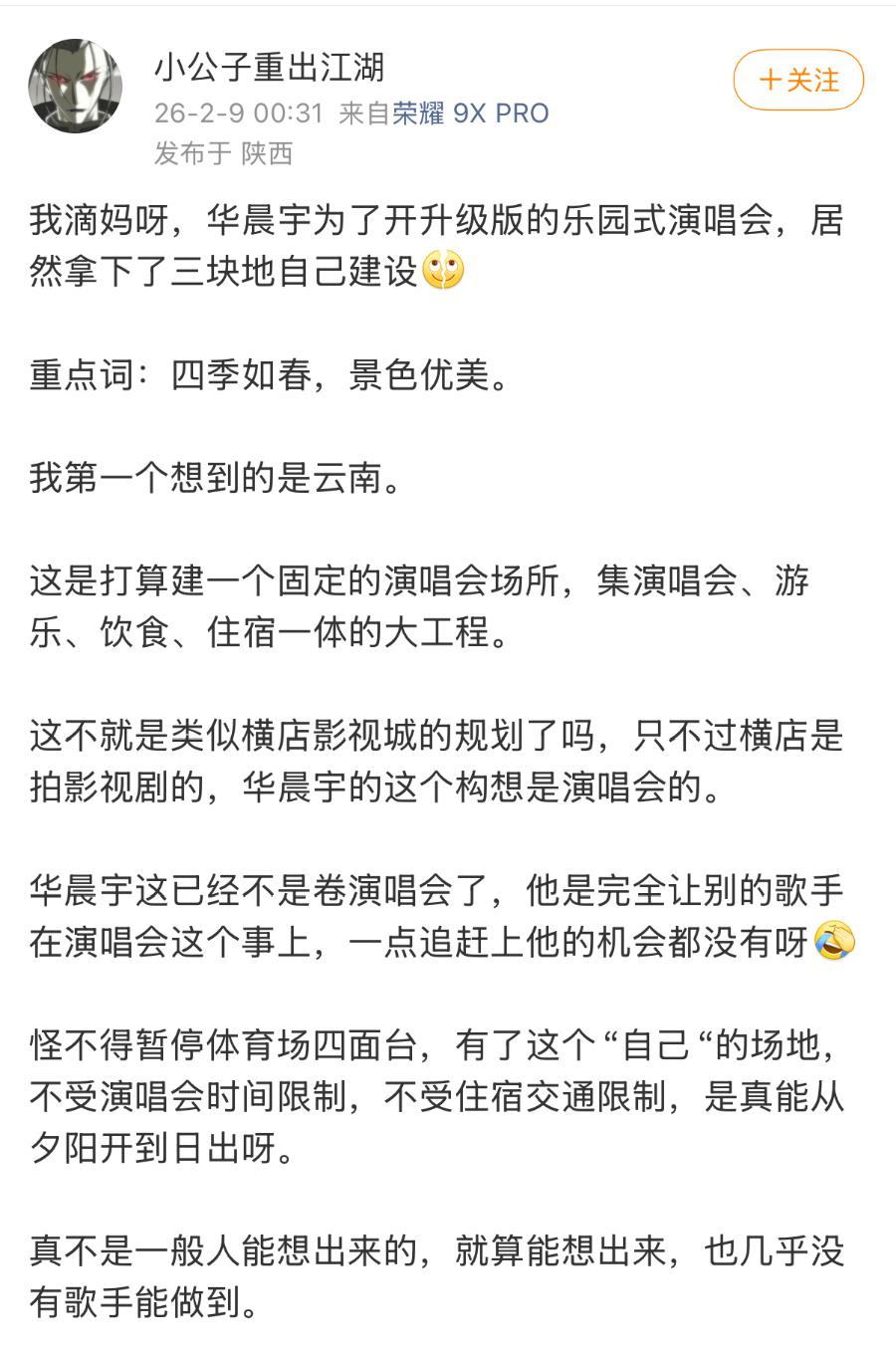 而华晨宇宣布将在 2026 年将 " 火星乐园 1.0" 模式升级为 "2.0" 模式,有分析人士称其中的重要举措,或是将寻找一处永久场地,围绕其个人 IP 和演唱会的独特模式进行更为持续与深度的开发。