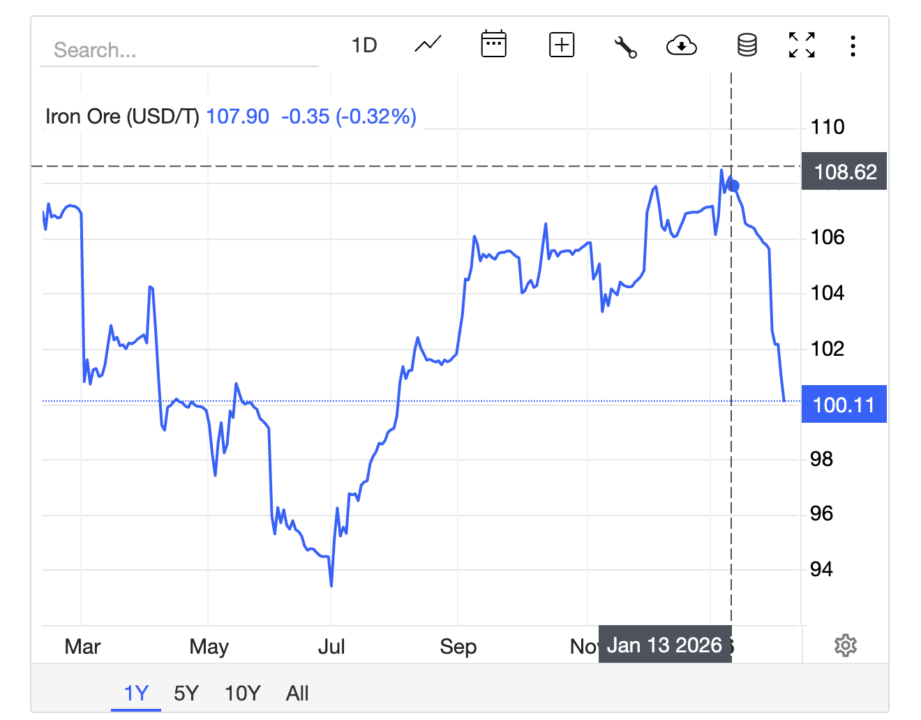 2月6日,铁矿石价格自2025年8月以来首次跌破100美元/吨。其中,新加坡交易所61%品位铁矿石期货价格一度下跌1.3%至99.35美元/吨(约合687.89元人民币/吨)。