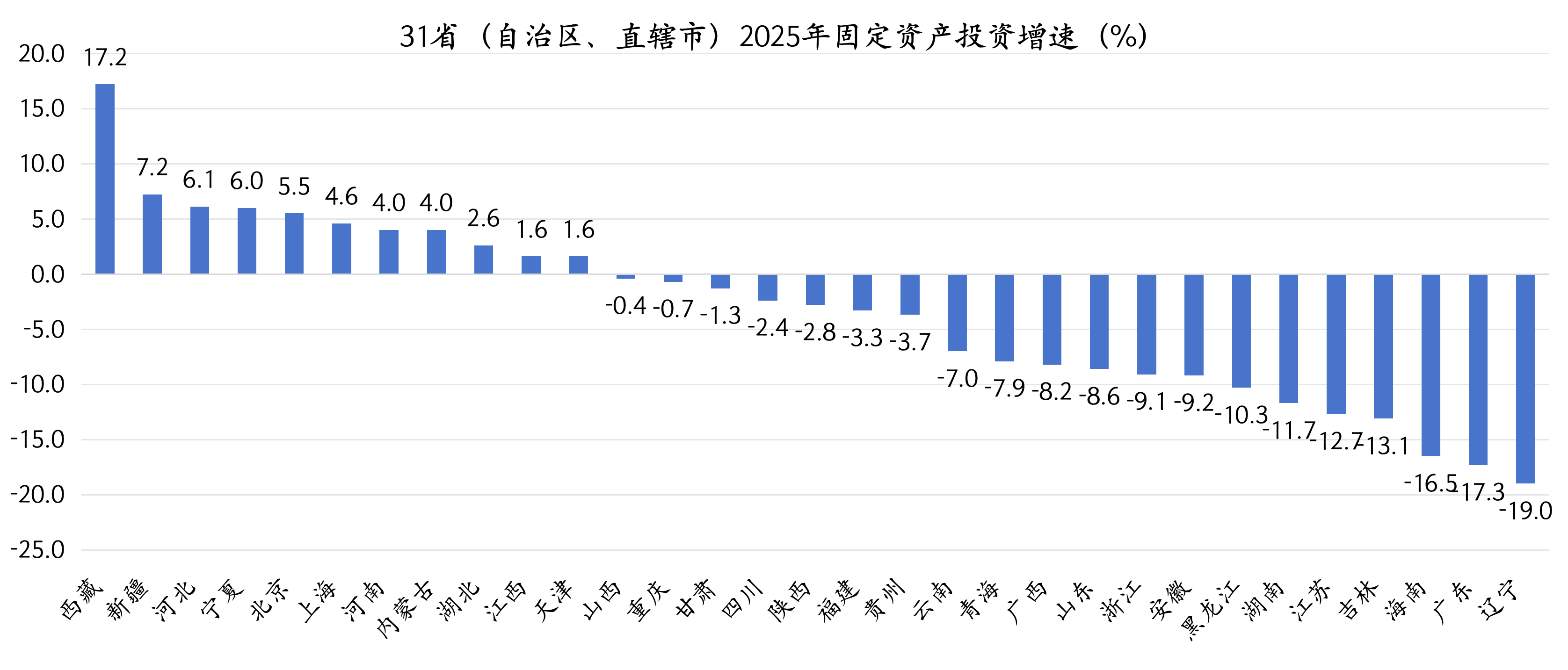 2025年,全国有20个省份固定资产投资负增长,西南、东北以及东部一些经济大省的投资增速降幅较大。