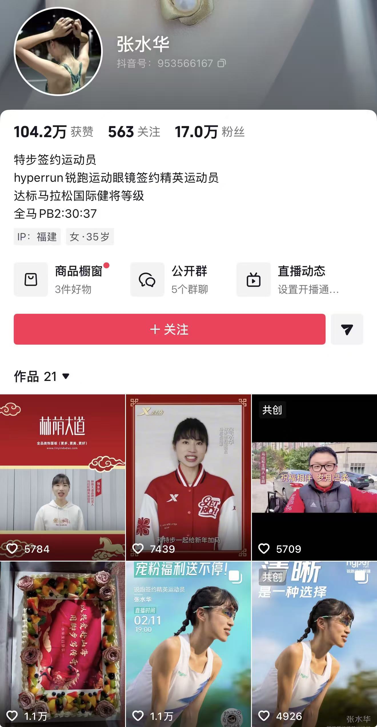 2月16日,界面新闻查阅发现,目前张水华的个人社交账号签名已更新为“特步签约运动员、hyperrun锐跑运动眼镜签约精英运动员”,已积累17万粉丝。