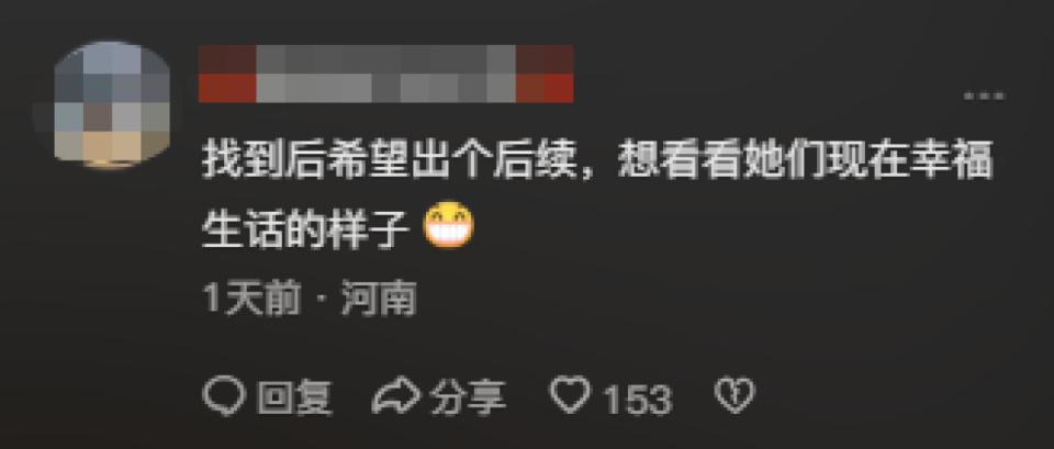 2 月 17 日,河南驻马店泌阳县,博主 " 三毛 " 在网上发布的一个寻人视频引发网友关注。寻人视频称,想找到自己于 10 年前抓拍到的一对母女,并附照片。2 月 19 日,大河报《看见》记者联系到了照片中母女的家人吴先生,吴先生介绍称,妻子于近日看到这组照片后非常惊喜,笑了半天。女儿看到后也笑称:" 自己小时候咋这样?" 吴先生说,以前家里不怎么拍照,他已跟 " 三毛 " 联系上并珍藏了这组照片。