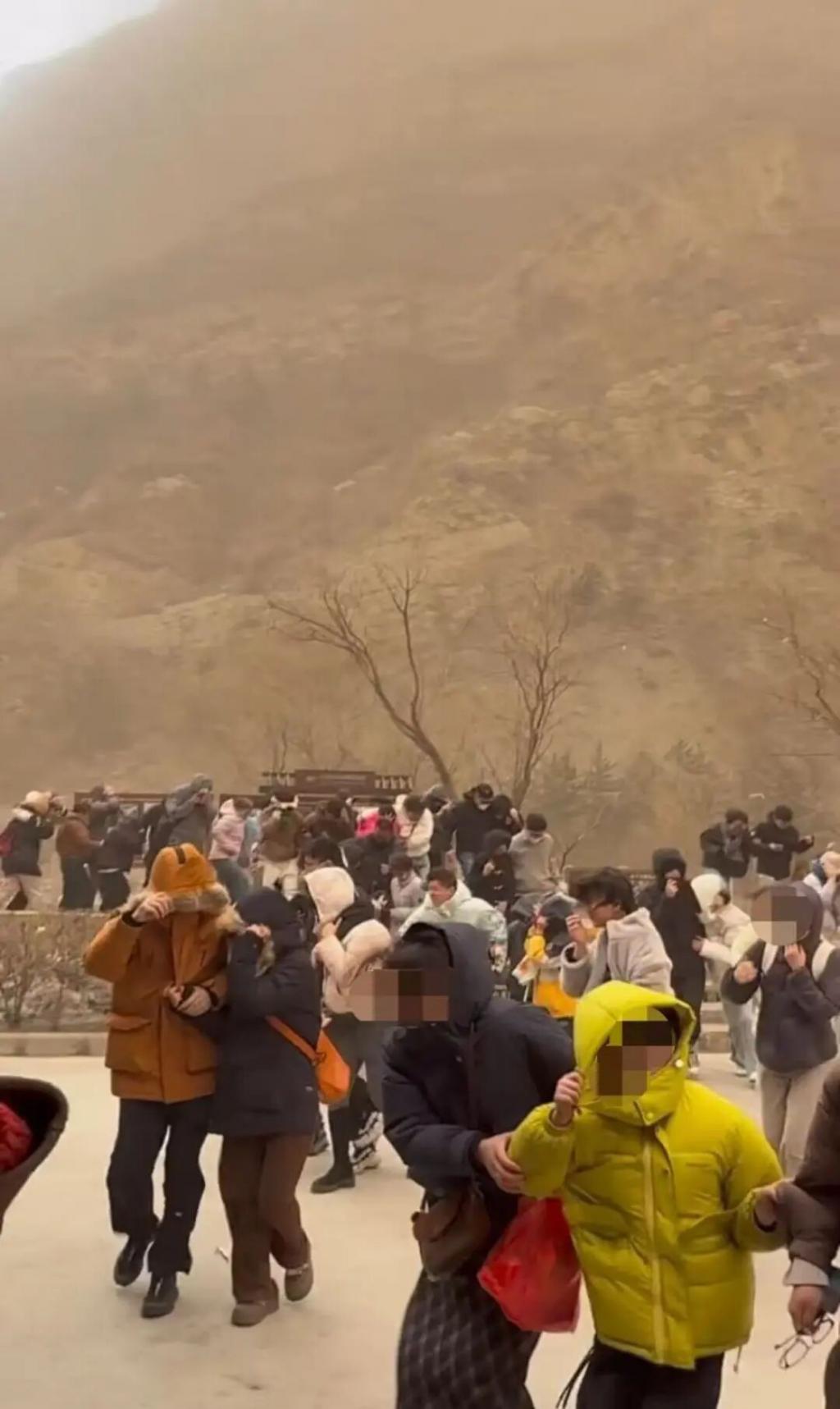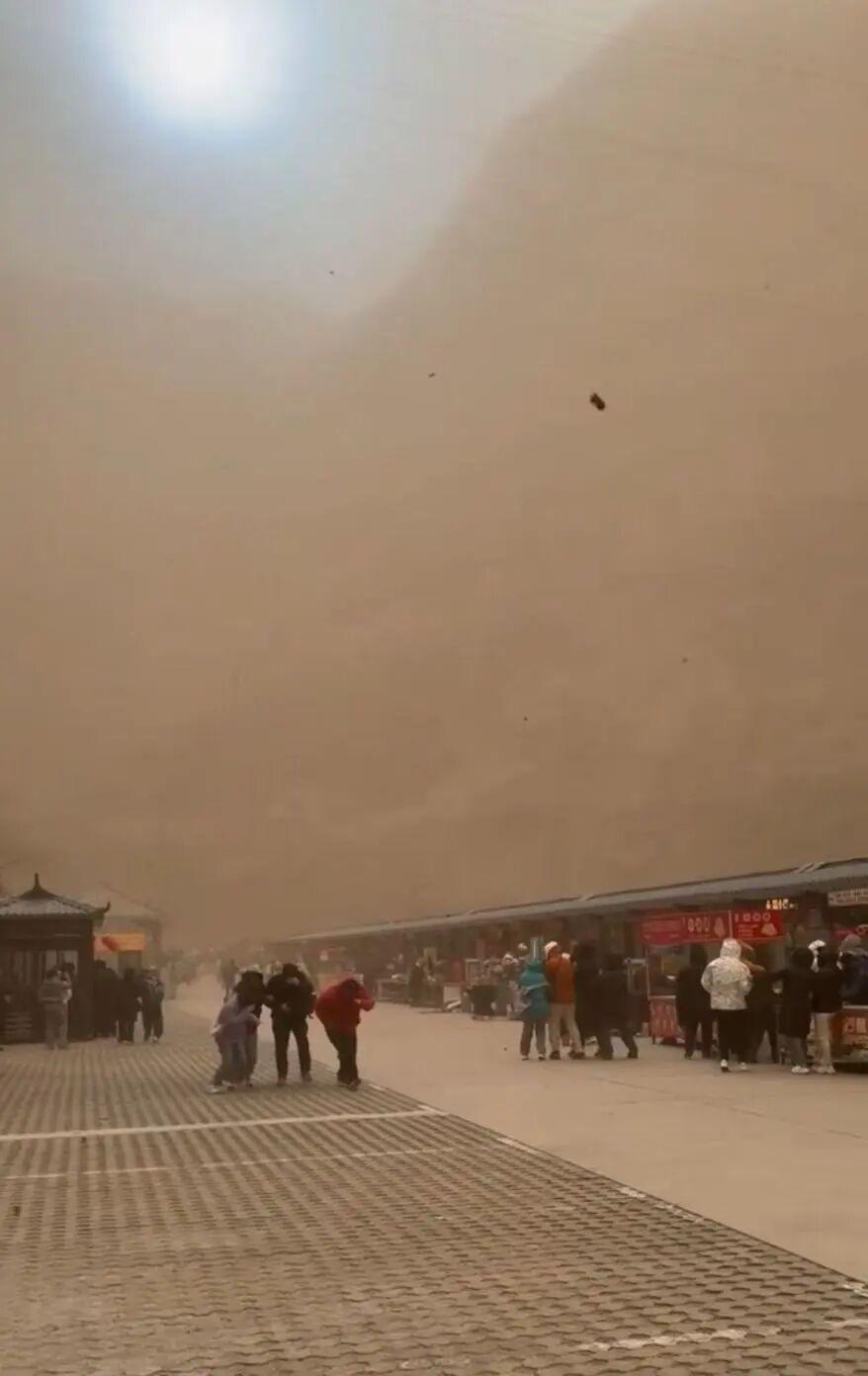 网友发布的视频显示,大同市浑源县恒山景区,出现了扬沙天气,一时间,天地间黄沙弥漫,建筑物被厚重的沙尘笼罩,能见度很低。