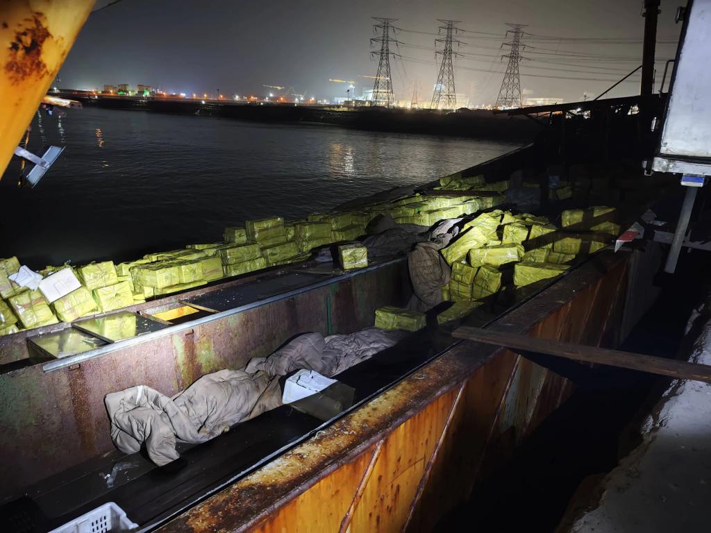 行动前,该局通过海洋智能态势感知系统研判线索,通过轨迹追踪、蹲点摸排等方式,全面掌握涉案船舶活动规律与上岸卸货时机,周密部署行动。行动中,海警执法员快速封锁码头出入口,同步登船检查与现场控制,当场锁定船名号为粤某渔 XX 号的涉案散货船。经现场清点,船上装载箱装鲜活夏贻贝、雪蛤等海产品 100 余吨,均无法提供合法凭证,涉嫌走私。案件正在进一步侦办中。