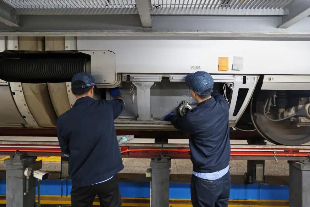 当晚 8 时 28 分,该趟复兴号动车组列车驶入南宁动车所检查库,地勤机械师严芝科和搭档张浩早早就备好了工具材料,等候在一旁。