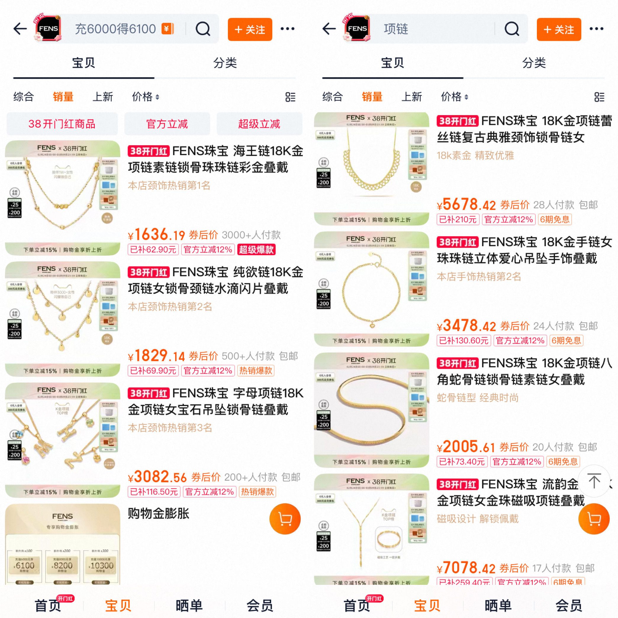 首先是原材料成本高,导致其缺乏价格优势。FENS与APM、施华洛世奇、HEFANG等品牌一样,做的是讲究日常搭配、饰品化的时装珠宝。FENS和这些品牌同处千元的轻奢价格带,但由于18K金成本高,整体定价相对更高。界面新闻在天猫旗舰店看到,FENS品牌两千元以上的产品占比较高,而前述其他品牌大部分产品都在两千元以下。