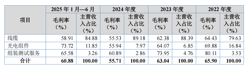 毛利率方面,报告期内,文峰光电主营业务毛利率分别为65.90%、63.04%、55.71%和60.88%,远超线缆行业20%左右的平均水平,甚至高于大部分军工电子类企业。对此,公司称,是由于技术积累、服务能力及行业特性。
