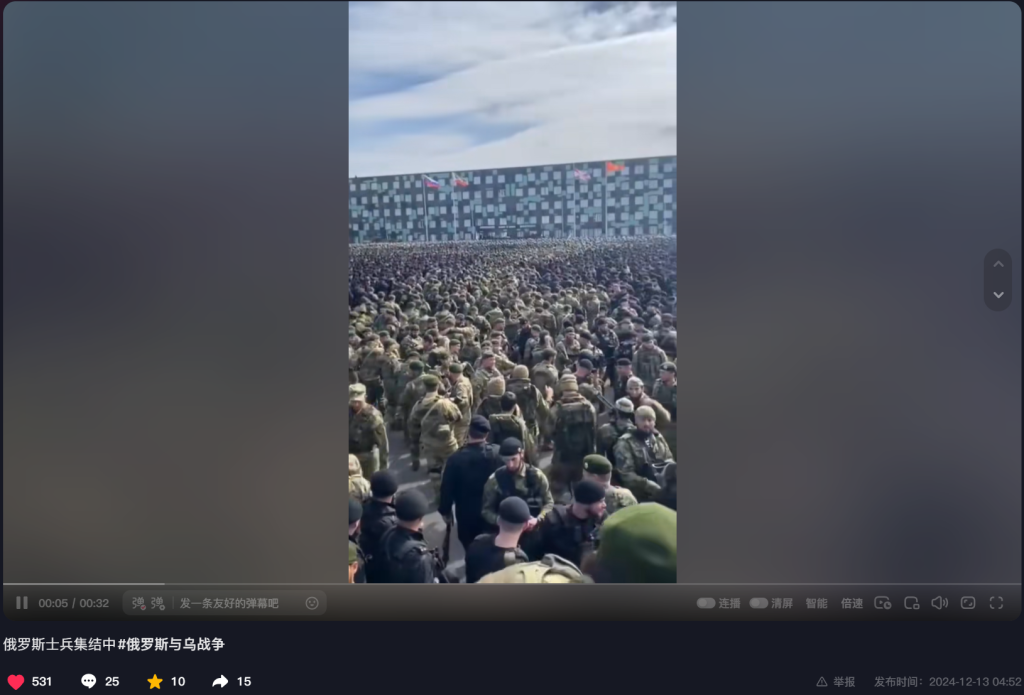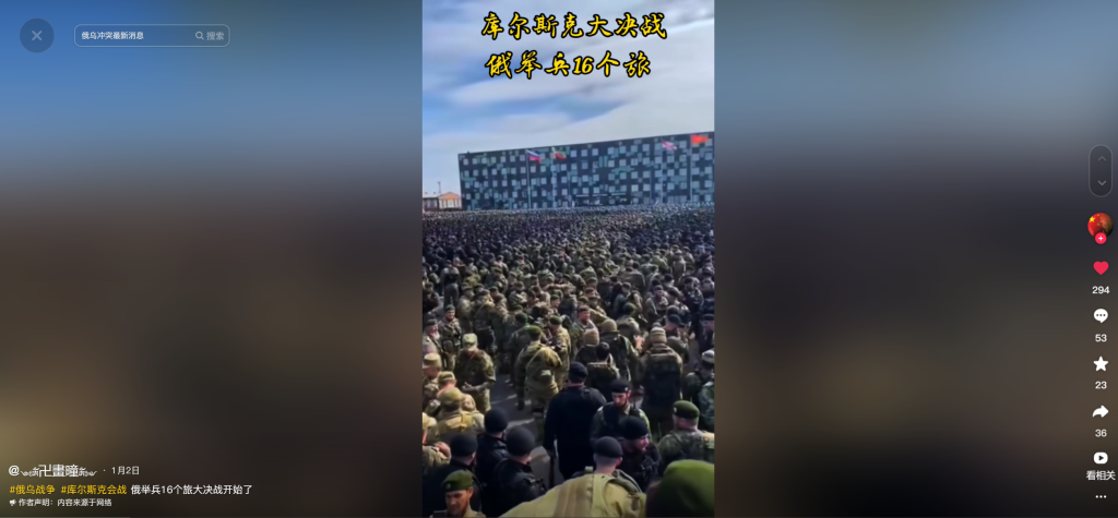 使用InVID软件截取网传视频的关键帧并进行反搜,可以在微博、抖音、X和TikTok等平台上找到与网传视频画面内容一致的视频,这些视频的配文多为:“俄罗斯士兵集结中”“俄乌局势新进展”“库尔斯克会战”。