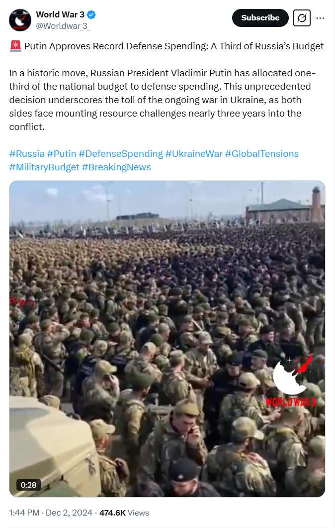 其中,最早上传的版本可追溯至 2024 年 12 月 2 日,X 账号 worldwar_3_ 发布的视频配文称,在一项具有历史意义的决策中,俄罗斯总统普京批准将全国预算的三分之一用于国防开支。