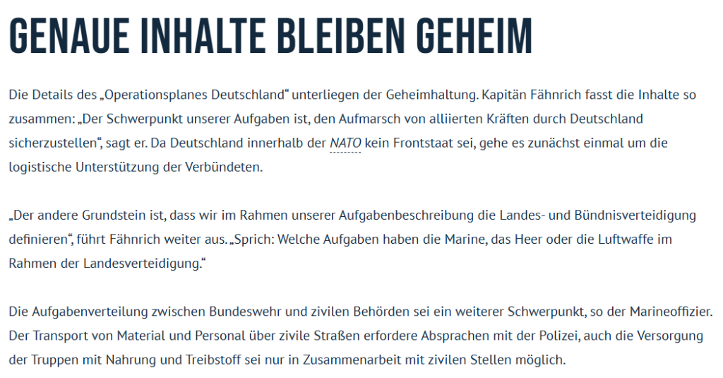 德国联邦国防军网站信息显示,“德国行动”的具体细节处于保密状态。不过,德国联邦国防军领土司令部的弗兰克·费恩里奇(Kapitän z. S. Frank Fähnrich)表示,由于德国在北约框架内不是前线国家,该国军方的重点任务是对盟军的后勤支持。