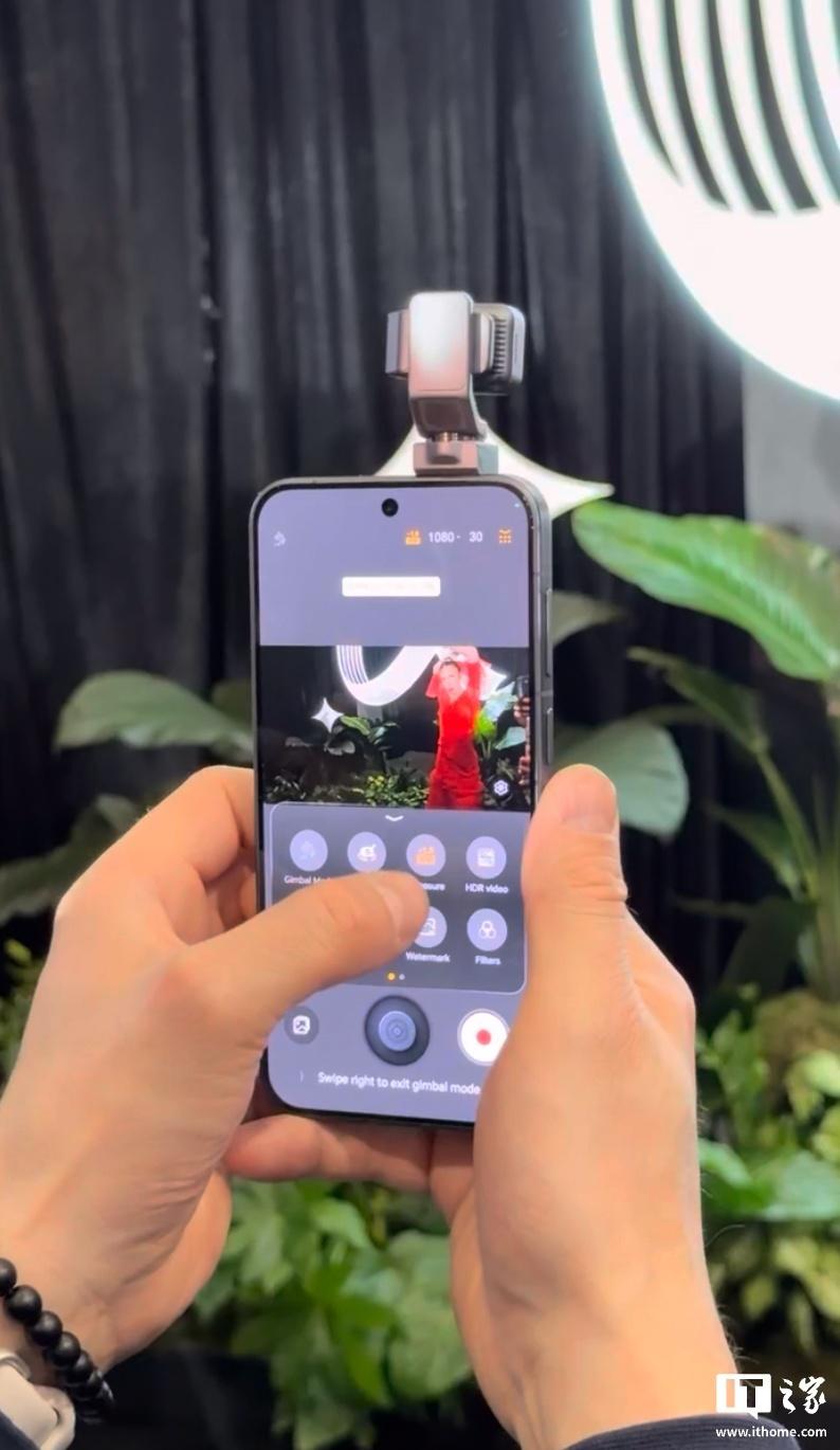 根据现场演示我们可以看到,这台手机相机界面的操作逻辑第一眼看上去有点像 LG Wing,不过整体 UI 布局完全针对云台相机进行了优化,能够直接从预设库里调出旋转运镜等操作,方便用户一键拍摄大片,下拉菜单里还有滤镜、HDR、曝光补偿等选项可调整。