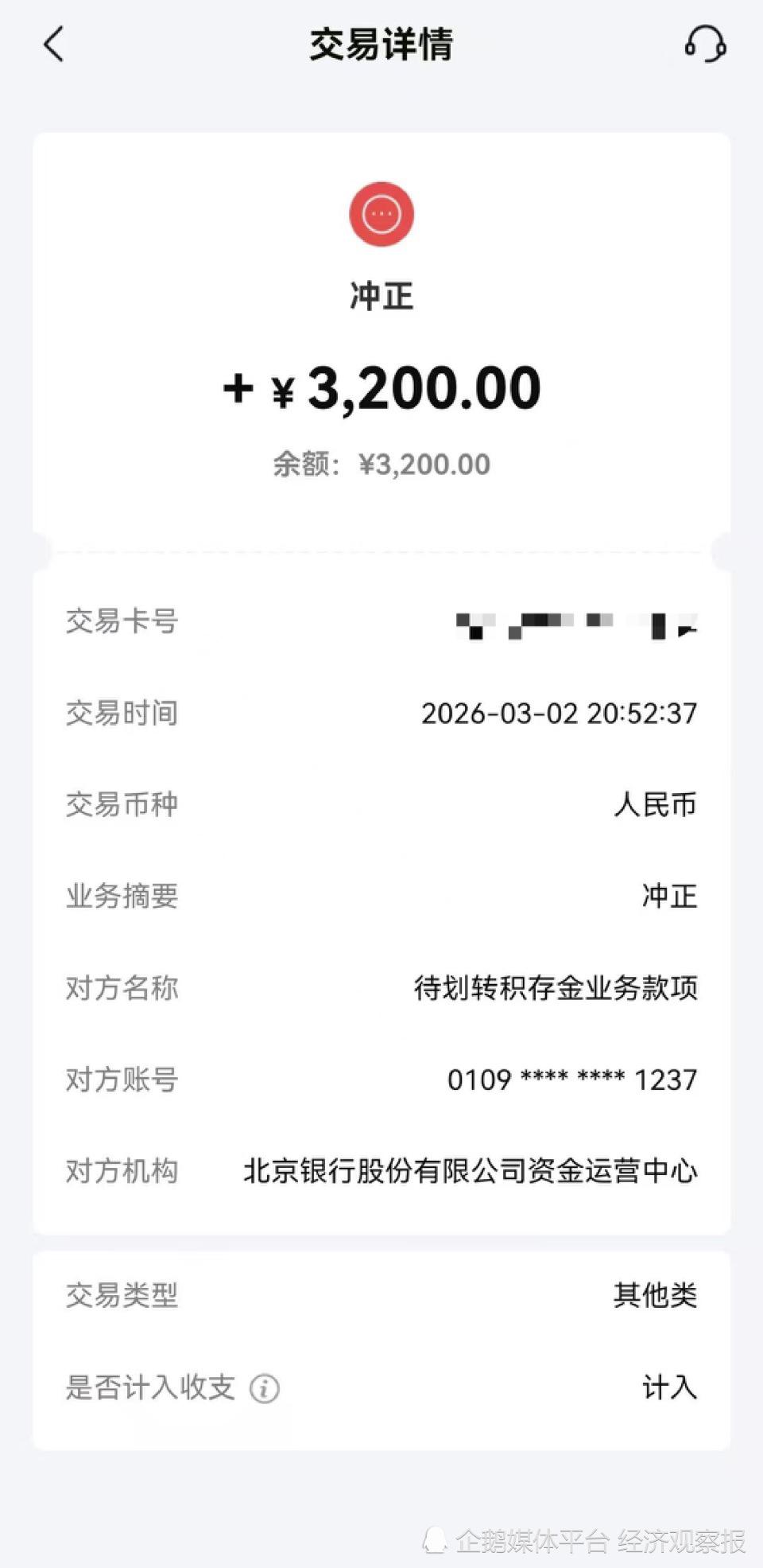 3200元买了2000克积存金,北京银行:扣回、冲正