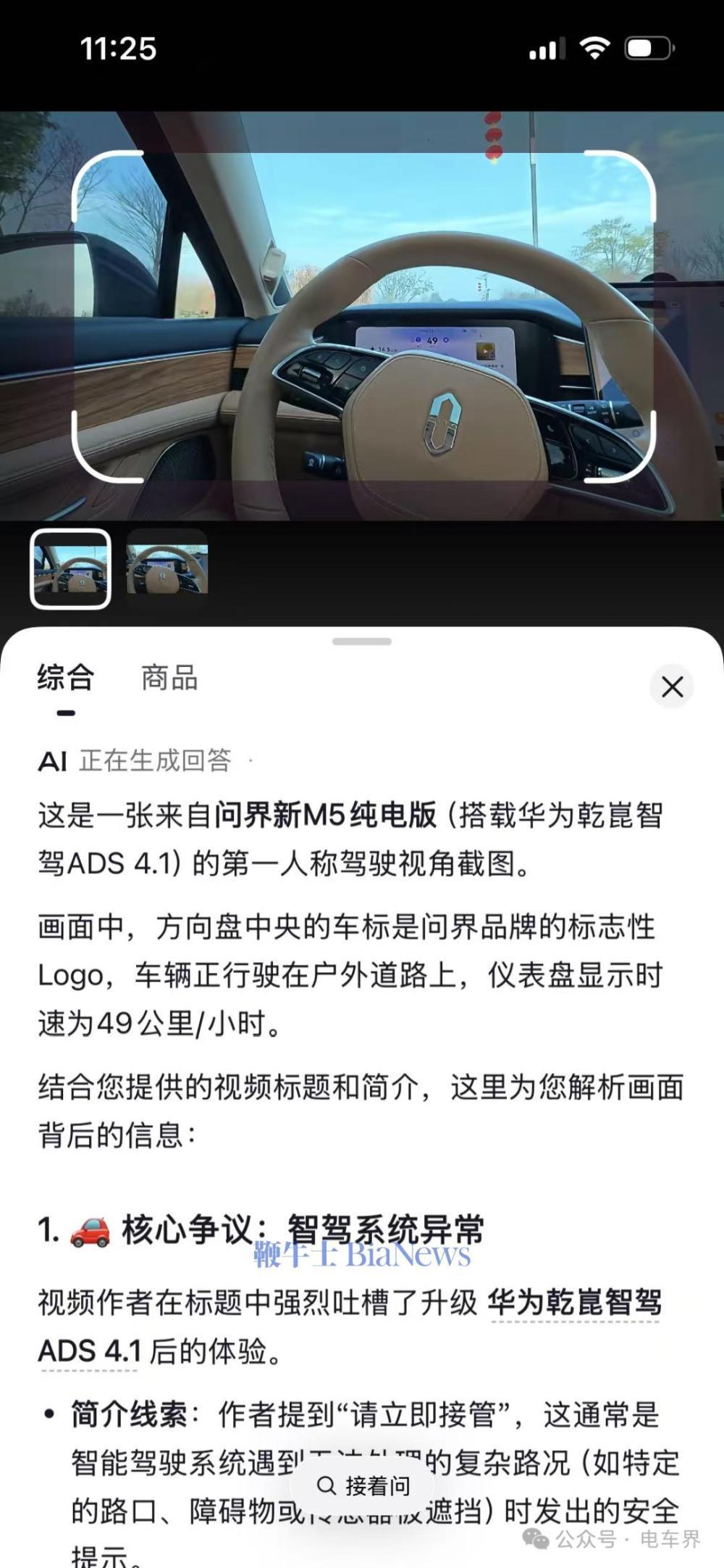 小编又找了张没有花屏的问界驾驶舱视角照片,这次抖音里的 AI 识别为 " 问界新 M5 纯电版 ( 搭载华为乾崑智驾 ADS4.1 ) 的第一人称驾驶视角截图 "。