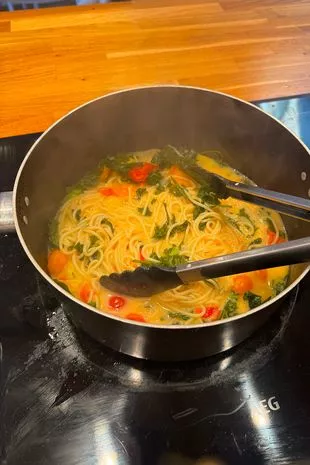 在煮熟之前不久,食谱上说要加入羽衣甘蓝和甜菜,还有一些火箭菜,让它有“辣味”,她建议再煮五分钟,然后关火。她说她的“面条很有嚼劲”,然后在上面磨碎了一些帕尔马奶酪,最后完成。
