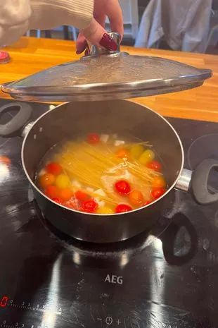 她告诉观众:“你只要把开水倒在上面就行了。”我的锅不能和她用的那道精致的Le Cruset菜相比,但不管怎样,意大利面被盖住了。对我来说,把西红柿和羊乳酪一起煮意大利面似乎很奇怪——但如果这是她的方法,我又有什么资格反驳呢。我让水汪汪的混合物煮沸。