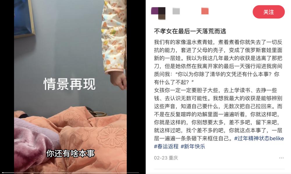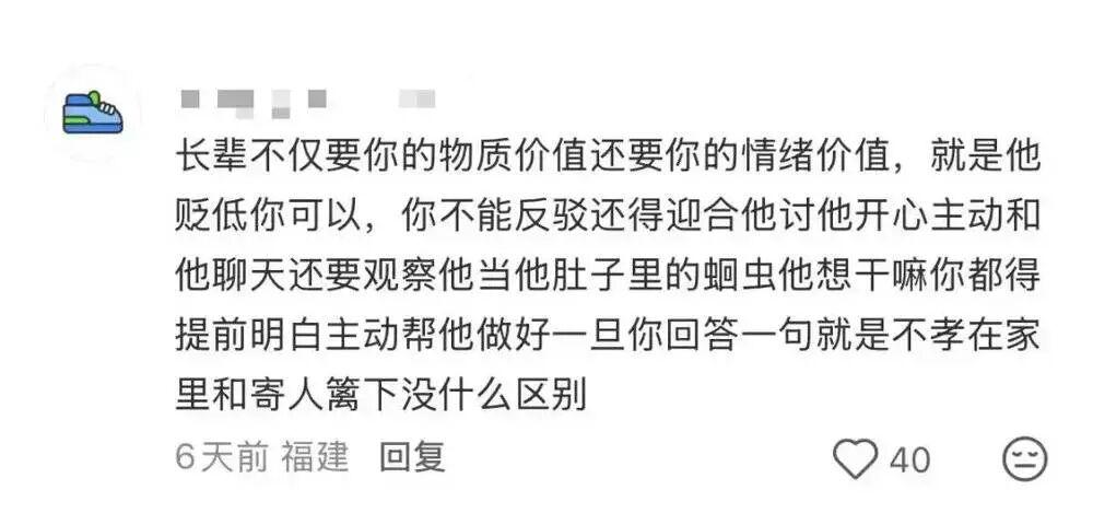 同样困境的年轻女性在她的评论区里互相取暖。她们几乎都没有度过一个平稳的新年,家庭矛盾大多是一致的:催婚,催生,催上岸,哭穷,阴阳怪气,指责埋怨。