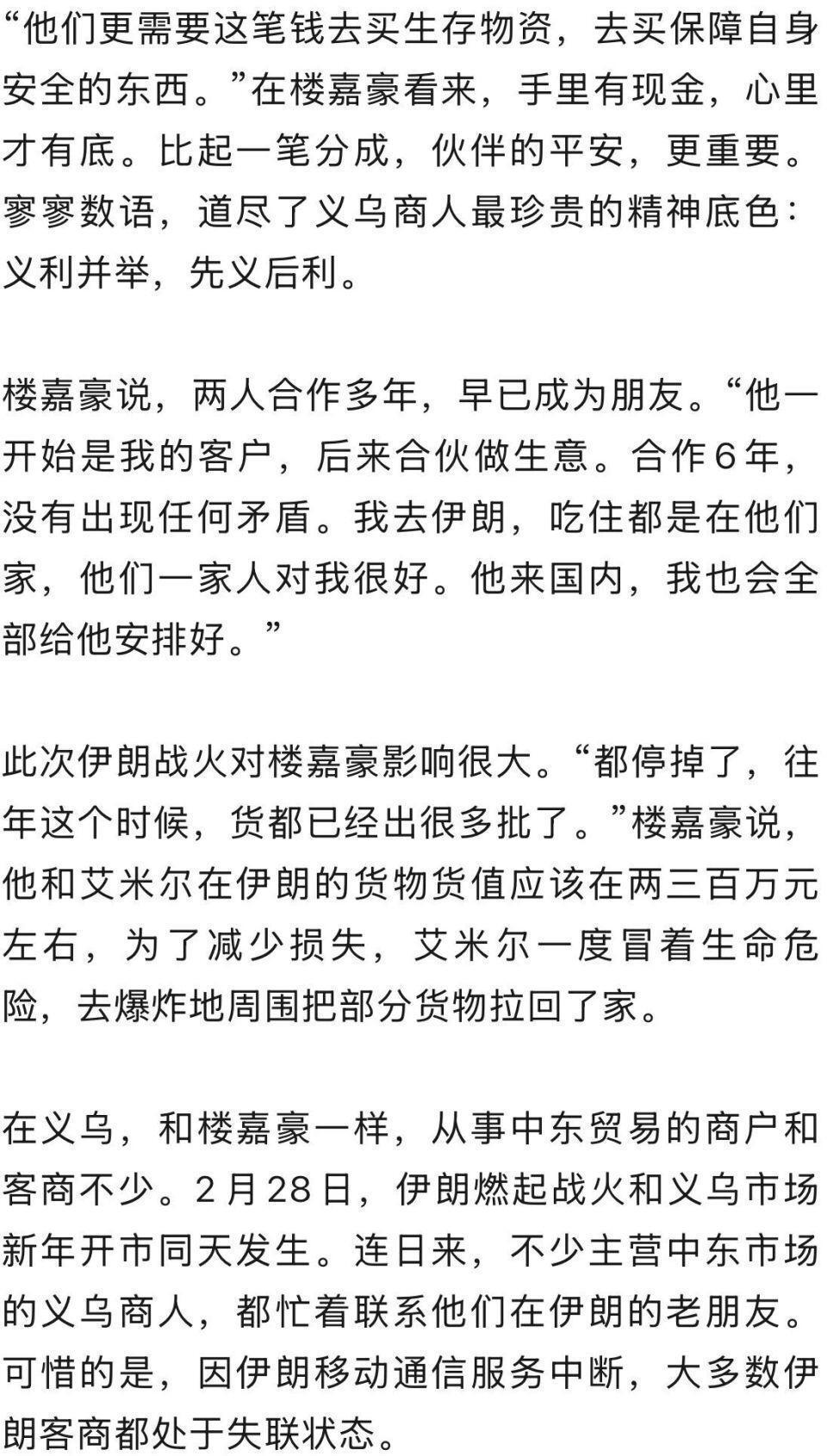 北京时间 3 月 6 日,在万里之外的浙江金华义乌,一笔本该按时从伊朗转回的外贸分成,却被义乌商人楼嘉豪果断按下了 " 暂停键 "。" 钱别转,你留着,希望你平安!"