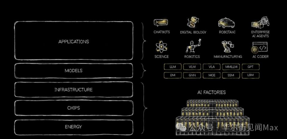 在文章中,黄仁勋提出了一个 AI 产业的结构框架:五层技术栈——能源、芯片、基础设施、模型、应用。