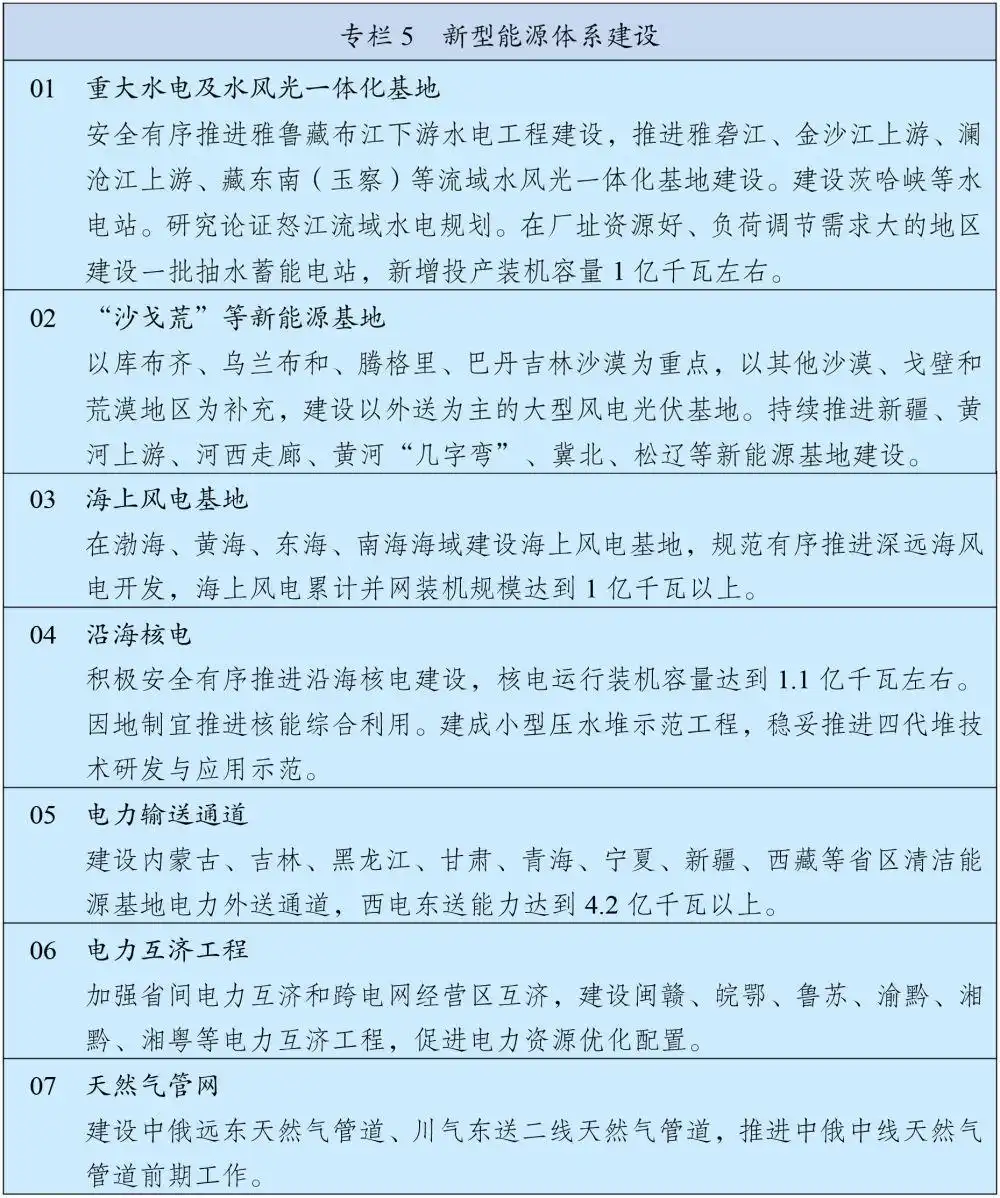 在加力建设新型能源基础设施板块,“十五五”规划纲要要求,深入实施能源安全新战略,加快构建清洁低碳安全高效的新型能源体系,建设能源强国。