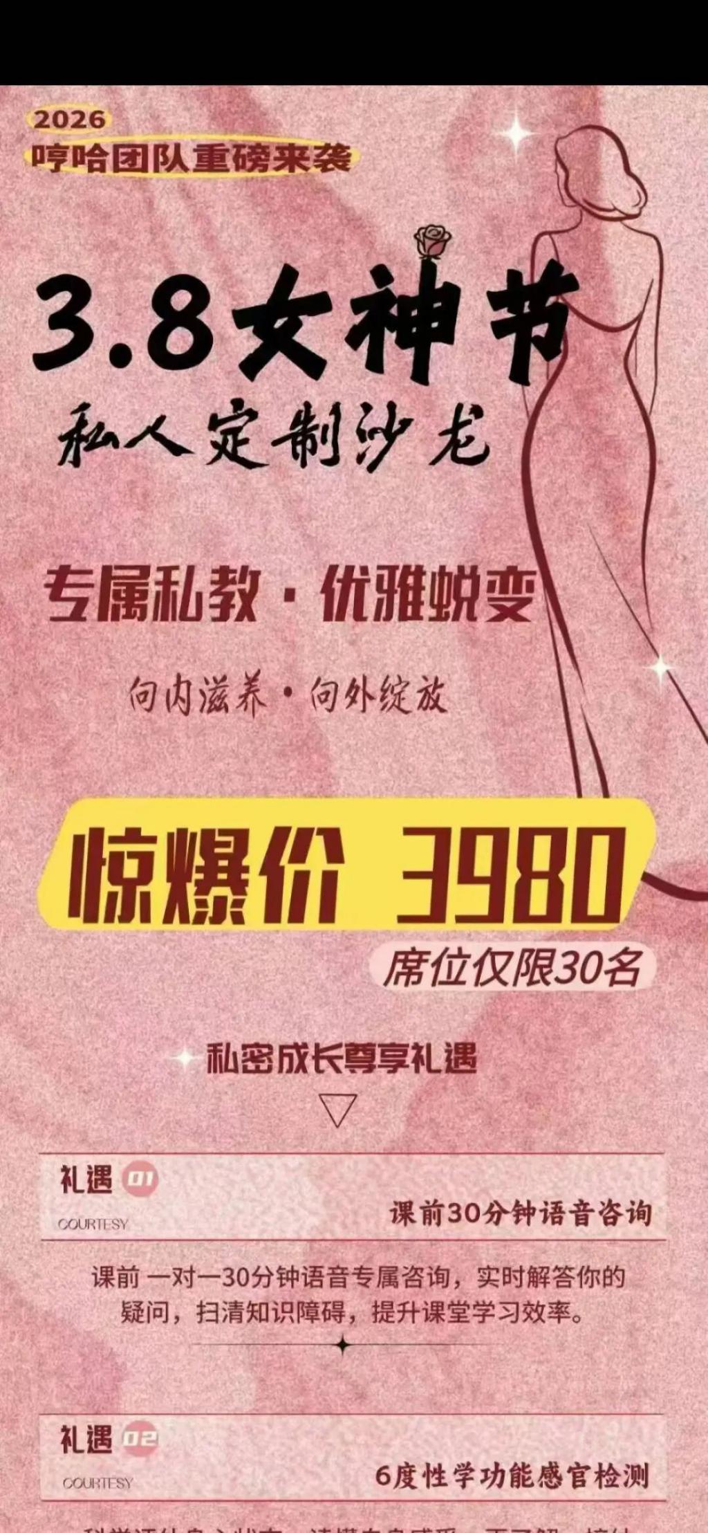 相关小程序显示,目前曲曲的课程仍以 " 金贵的关系 "、"1v1 咨询 "" 闺蜜联盟 " 等为主,其中闺蜜联盟报价超 19 万元。除此之外,她也加入了和黑白颠周媛相似的性学相关课程并售卖私密保养,其中其私人订制沙龙售价 3980 元。