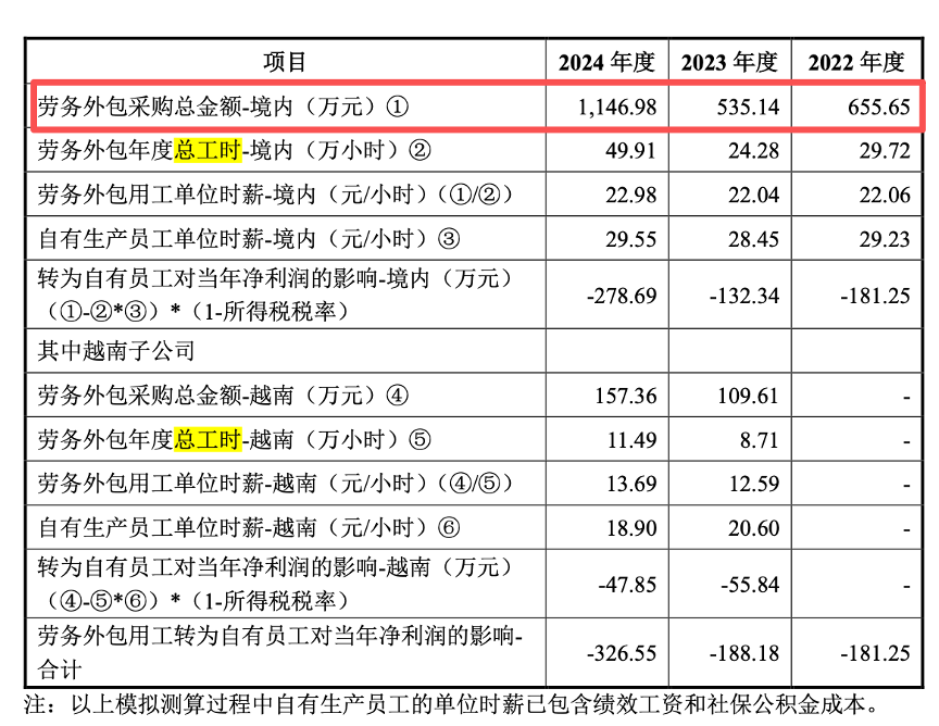 与此同时,奥立思特在生产端的劳务外包成本出现了大幅攀升。审计报告及问询函回复数据显示,2024年度公司境内劳务外包总工时达到49.91万小时,境内外劳务外包采购总金额合计达到1304.34万元,较2023年呈现翻倍式增长。公司解释称这是为了“通过增加劳务外包来消化公司新增的生产需求”,但这种高度依赖外包的模式也从侧面反映了其内部产能调度弹性的局限。