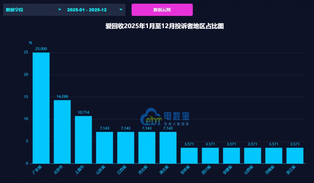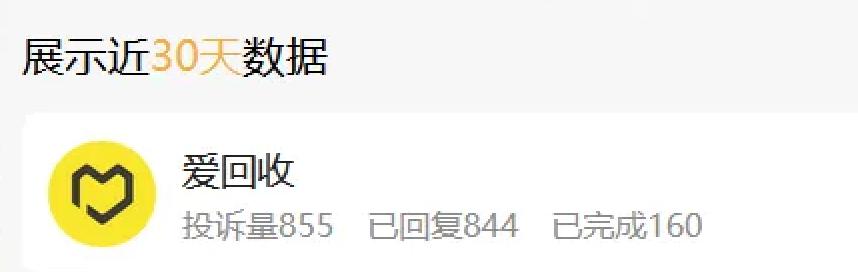 截至 2026 年 3 月 13 日,黑猫投诉平台上,爱回收累计投诉量已超 2.4 万条,近 30 天投诉量达 800 余条;2025 年以来,电诉宝平台上爱回收相关投诉量居高不下,核心集中在五大类,且多为重复性问题,充分反映出问题的普遍性和顽固性。