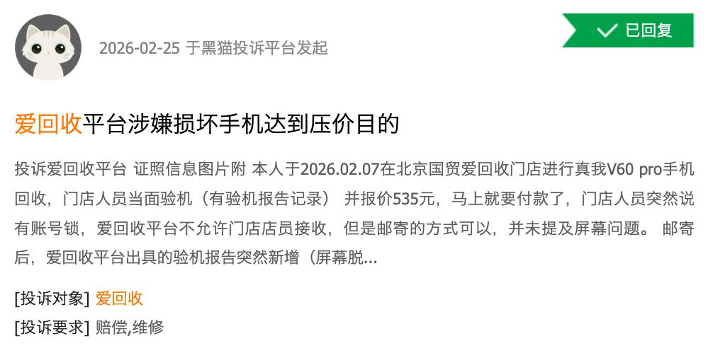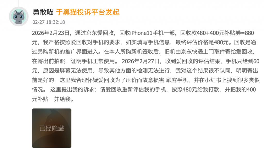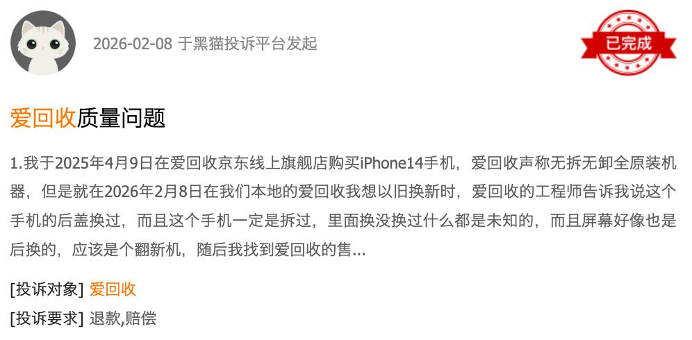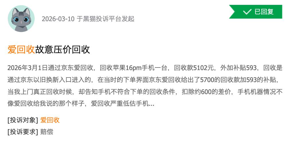 2 月,有用户通过电商平台爱回收渠道回收 iPhone11,线上估价与验机后报价差距悬殊,即便拿出寄出前的证据,也未获得平台合理回应;另有用户因平台以旧换新规则模糊,旧机回收价变动后,原本承诺的补贴失效,进而引发不满。