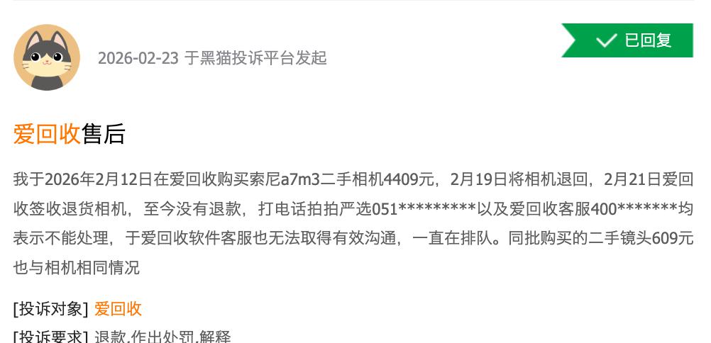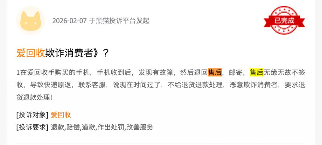 消费者遇问题时,客服响应慢、推诿扯皮,维权耗时费力。有消费者在爱回收购买二手产品后申请退款,客服承诺明确时限却反复拖延;还有用户手机质保期内出现故障,平台未做任何专业检测,就以 " 人为原因 " 为由口头拒保,协商无果,这类售后推诿问题在投诉中频繁出现。