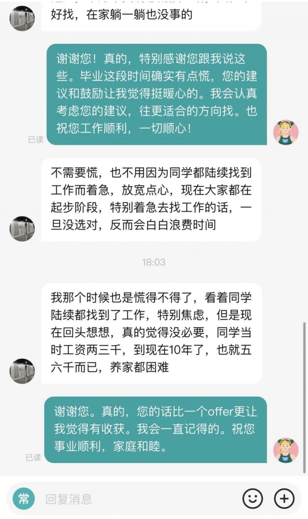 对于左先生的安慰,张女士记忆犹新," 他说‘当时我和你一样,特别是看着同学陆陆续续找到工作了,更是慌得不得了。但是现在想想,真的觉得没必要。’ " 这番话让张女士深受触动," 其实他说的都印象很深,因为他说的那些,一般都很少会有人在生活中说的。他说他毕业之后也是基层做起来的,当时也各种迷茫,他叫我千万不要病急乱投医。"