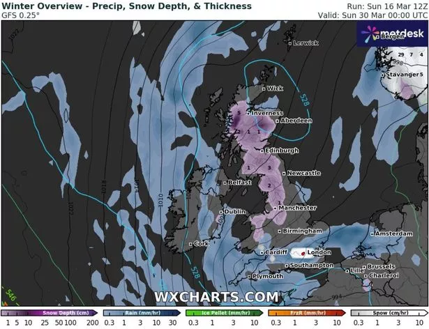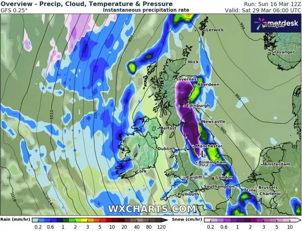 WXCharts的天气图显示,3月29日(星期六)有阵雨从北方席卷。清晨的降雪量可能达到每小时5厘米,坎布里亚郡、边境地区和苏格兰西海岸部分地区的降雪量最大。随后,这条雪带将扩大到从因弗内斯郡到曼彻斯特约500英里的大片地区,几乎覆盖了整个英格兰北部和苏格兰的大部分地区。与此同时,东北部、林肯郡和东安格利亚将有大雨,西南部和威尔士的一些沿海地区可能会有阵雨。