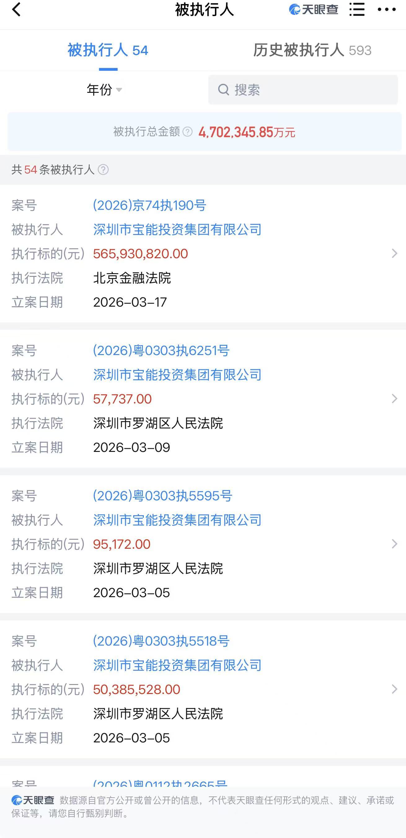 截至3月19日,宝能集团现存54条被执行人信息,被执行总金额超470亿元。此外,该公司还有失信被执行人(老赖)信息48条,涉案总金额超过42.9亿元;有356则终本案件,执行标的总金额约342亿元,未履行总金额约289.3亿元;公司目前还有293则限制消费令,涉案总金额超过383亿元。