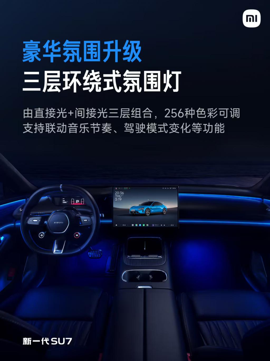 新一代 SU7 的内饰经过全新设计,新增暗夜黑配色,更显精致豪华。配备三层环绕式氛围灯,支持联动音乐节奏、驾驶模式变化等功能;运动方向盘握圈位置采用了 Nappa 真皮包覆,新增镀铬装饰点缀。