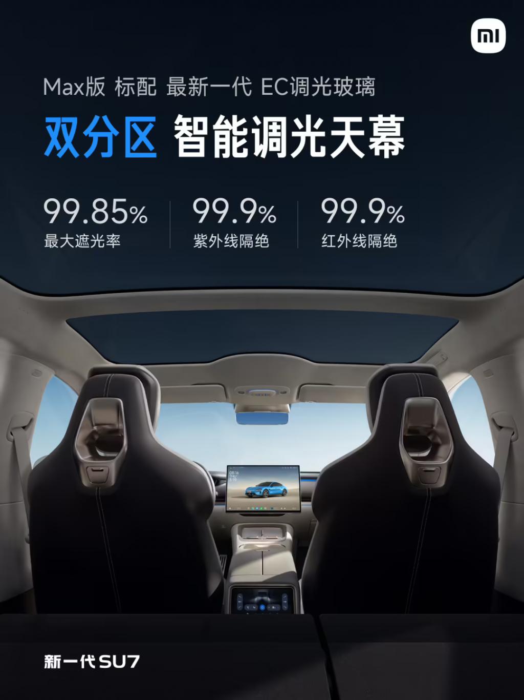 在舒适性方面,新一代 SU7 全系标配四门静音夹胶玻璃,Max 版可选超静谧座舱。Max 版标配双分区智能调光天幕,前后排天幕可单独调节,防晒隔热达到行业顶级水平。