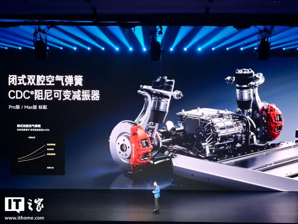 动力升级之外,新一代 SU7 全系搭载小米蛟龙底盘,号称 " 专为驾驶者打造的高性能智能底盘系统 ",全系升级 Ultra 制动踏板调校风格、全系标配固定卡钳、全系配备前双叉臂后五连杆独立悬架系统。