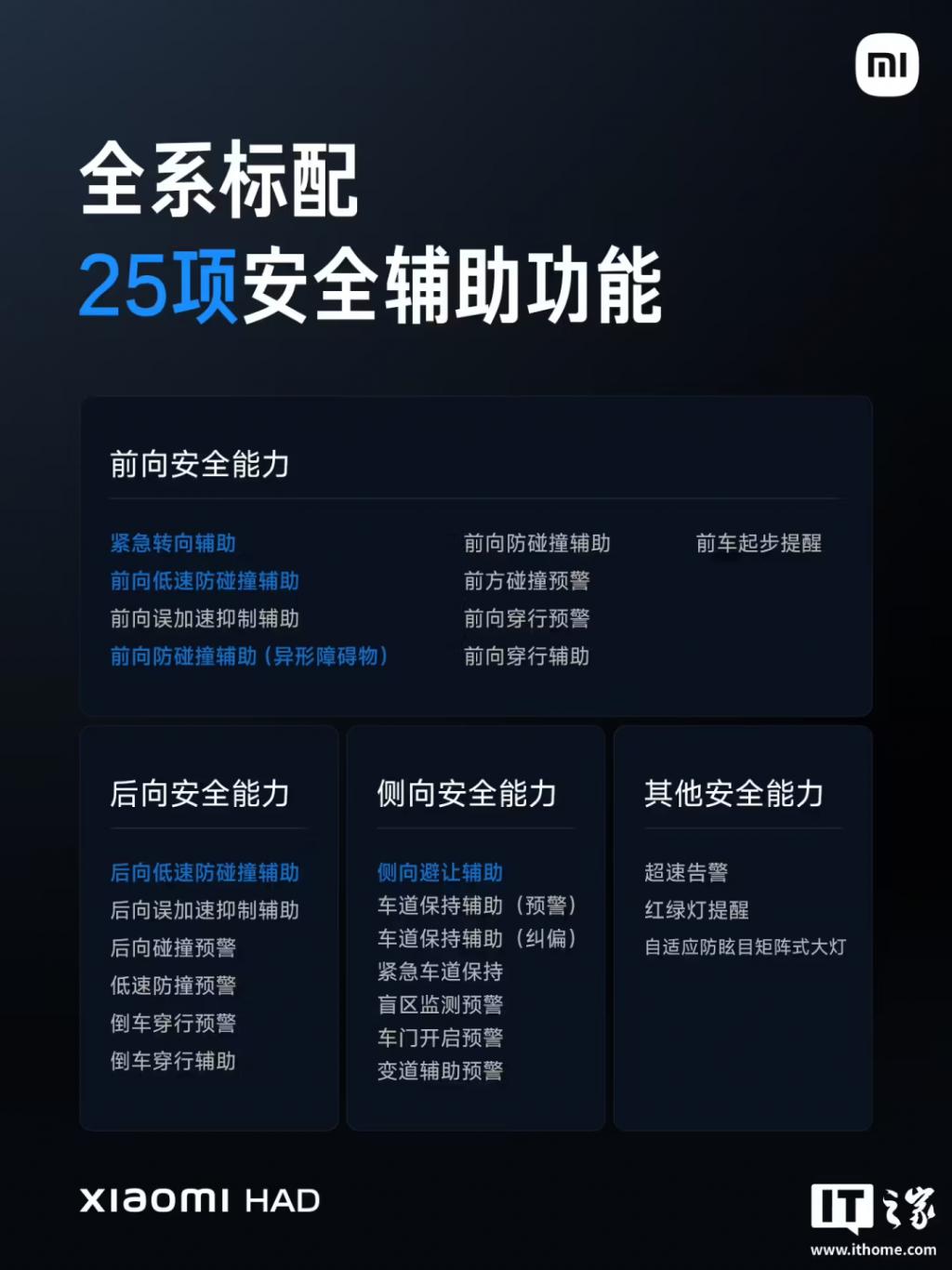 新一代 SU7 还全系标配 25 项安全辅助功能,覆盖前向、后向、侧向等安全能力,可实现紧急转向辅助、后向低速防碰撞辅助等。具体功能如下: