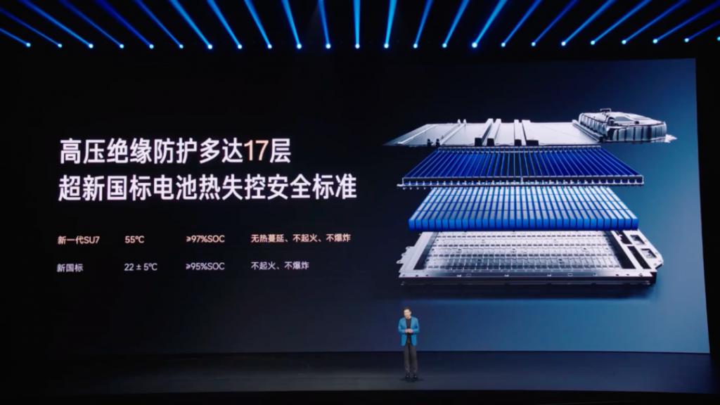 小米高度重视电池安全,新车电池采用 17 层高压绝缘防护,底部升级 SU7 Ultra 同款防弹涂层,底盘前部新增防刮底横梁,最大程度保护电池安全。
